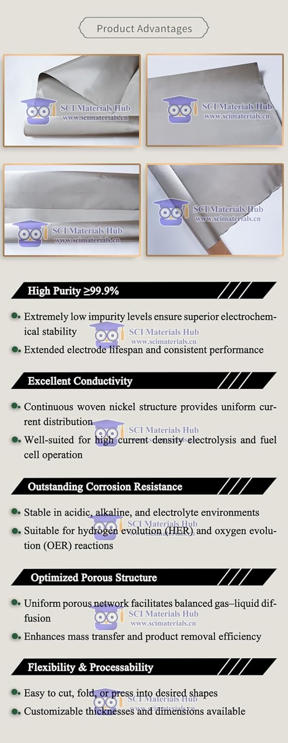 High-Purity Nickel Cloth is manufactured from ≥99.9% high-purity metallic nickel, offering excellent conductivity, corrosion resistance, and mechanical flexibility. Its woven porous structure ensures efficient gas–liquid transport, making it an ideal material for water electrolysis diffusion layers, fuel cell electrodes, battery current collectors, and catalyst supports.