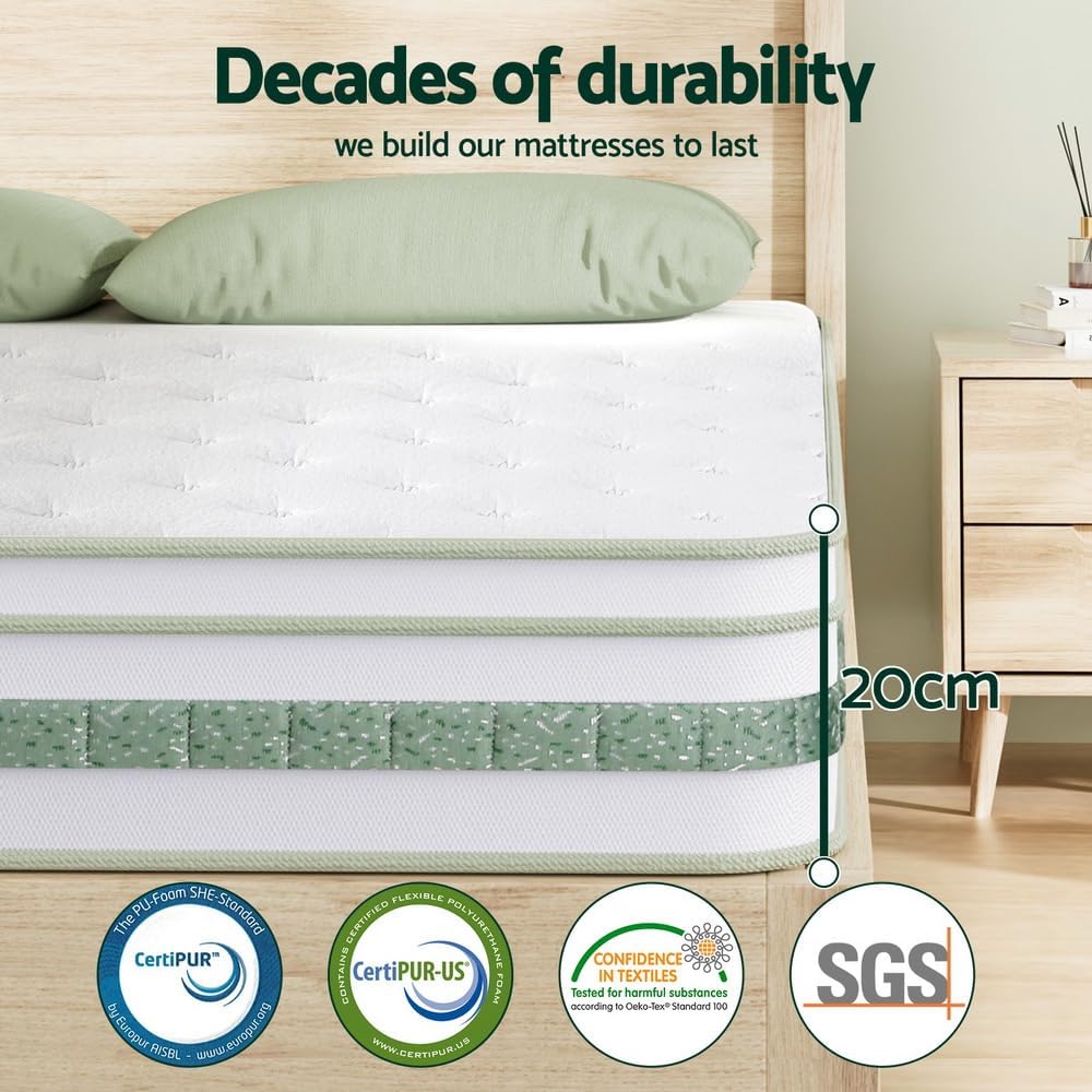 The Giselle Bedding Mint Series Mattress combines natural freshness with responsive support. Green tea foam helps maintain a fresher sleep environment, while the Euro Top layer cushions pressure points. Its 20cm profile features high-compression pocket springs and 6-turn coils that adapt to your body shape without losing firmness. Reinforced edges provide stable sleeping space, and the breathable bamboo fabric cover promotes airflow for temperature control. Available in 5 sizes (Single to King), it’s engineered for lasting comfort in warm climates.***NOT SUITABLE FOR CHILDREN UNDER 3 YEARS OF AGE***Features:Giselle Bedding - MINT Series20cm thick mattressPremium bamboo fabricHigh density green tea foamEuro Top designMedium-firm supportHigh compression pocket spring systemEnhanced 6-turn coilExcellent edge supportDust Mite & Insect ProofHypo-allergenic materialCertified by CertiPUR??, CertiPUR-US?, OEKO-Tex, SGSSpecifications:Brand: Giselle BeddingThickness: 20cmFirmness: 6.5/ Medium FirmColour: White&GreenQueen: 153cm x 203cmVacuum packaging: Item will expand to its normal shape within 1 day after unpacking. Assembly required: NoNumber of packages: OnePackage Content:Giselle Bedding Euro Top Mattress x1This product comes with 5 years warranty