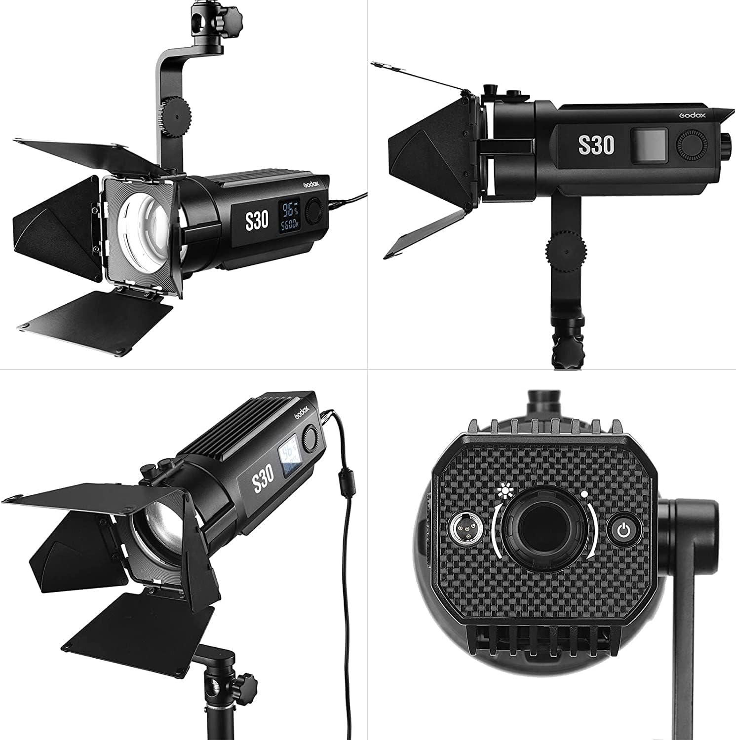 Godox S30 Spot Flash Photo for Character Photography, Dead Photography, Interview Lighting and Video Shooting etc Specifications: Power: Adapter power supply 15V/4A, 30W Lithium battery (Sony NP-F970/F950/F930) 7.4V, 10W External battery 5 V/2 A, 10 W. Colour temperature: 5600 K ± 150 K. 15V/4A 100% Illumination Adapter(LUX)(1m, Black Room): Spot(Central Region)≈11300, Flood(Central Region)≈2800 Photometric: 0.5 m: 40000 lux (spot), 11000 lux (flood). 1 m: 11300 lux (spot), 2800 lux (flood). 2 m: 3000 lux (spot), 750 lux (flood). 3 m: 1300 lux (spot), 350 lux (flood). 4 m: 740 lux (spot), 210 lux (flood). 5 m: 480 lux (spot), 145 lux (flood). Color Rendering Index: ≥96 TLCI(Qa): ≥96 Lighting range: 10%~100% Lighting angle: 6° to 55° Safe temperature: ≤70℃ Dimensions: 215 x 108 x 100 mm. Net weight: 907 g Package includes: 1 x body lamp. 1 x Barndoor set. 1 x 5 m power cord. 1 x wrench. Adapter*1 50 cm cable *1 180 cm cable*1 1 x USB cable. 1 x lithium battery box. 1 x portable bag