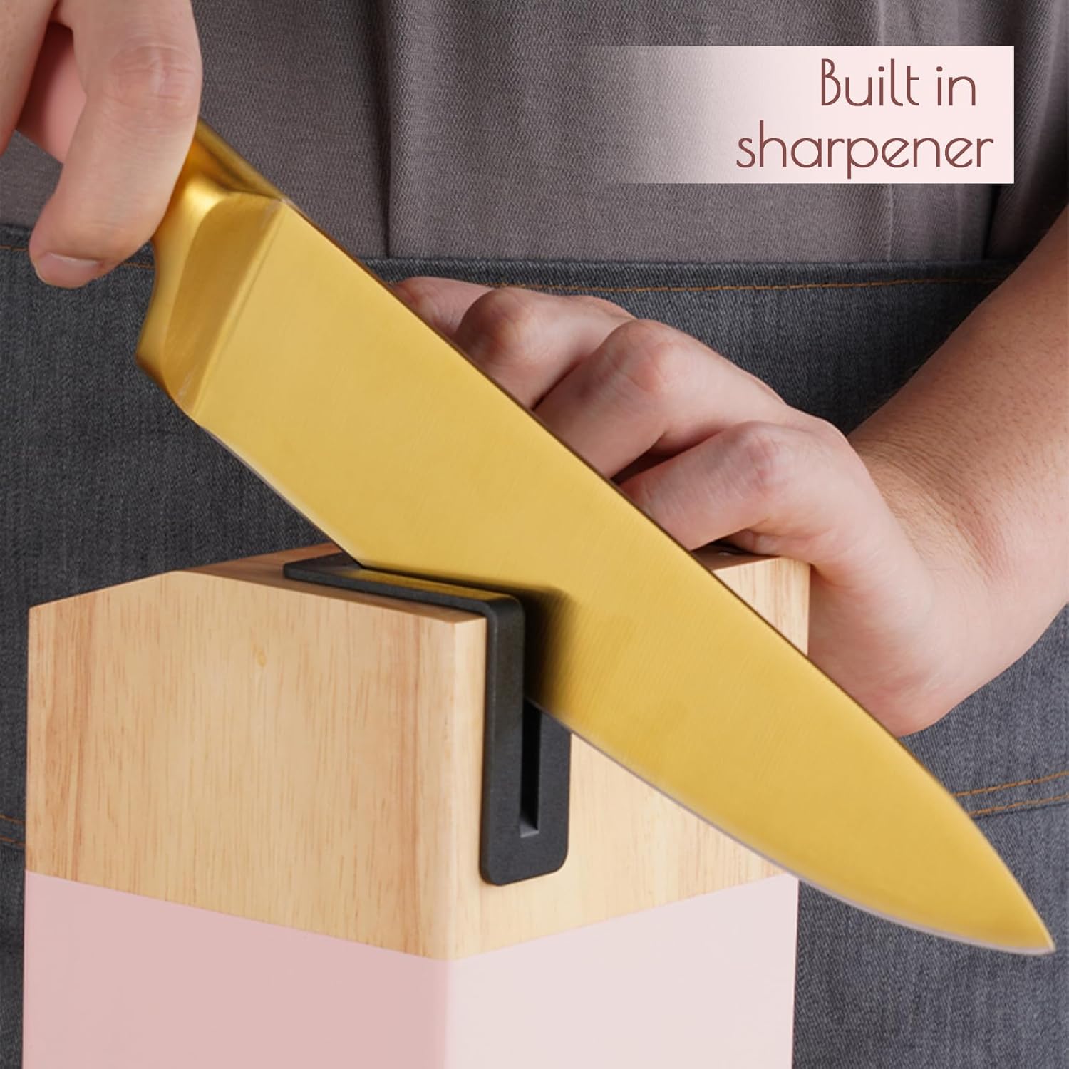 Gold Knife Set, 7 Pieces Titanium Coated Knife Block Set with Pink Wood Block, Ultra Sharp Stainless Steel Chef Knife Sets for Kitchen Built-in Sharpener, Kitchen Accessories and Decor (Pink)