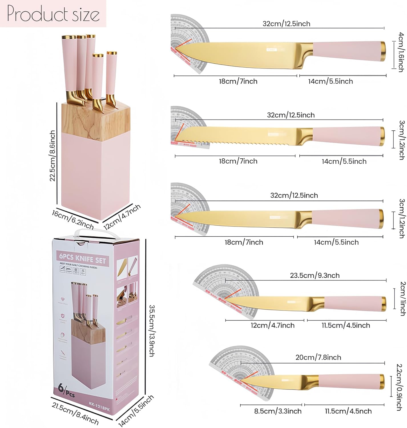 • 【Fashion Gold Knife Set】This 7-piece set of gold and pink knives enhances your kitchen grade. The set includes chef knives, bread knives, slicing knives, utility knives, fruit knives, all of which are packed in wooden knife blocks. This cooking knife set is very suitable for beginners and can meet the basic cutting needs.