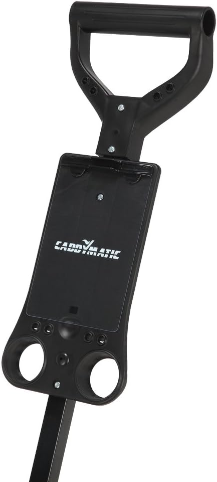 This Caddymatic golf cart is made from sturdy steel, and also includes a scorecard holder with storage for balls, pencil and tees.Features:Quick fold mechanism for easy storage and transportationQuick release wheelsStrong nylon bag straps and snap lock bucklesSmooth running ball-bearing wheelsSpecification:Overall dimension: 39 x 26 x 43.5inFolded dimension: 13 x 18 x 34inWeight: 9lbs