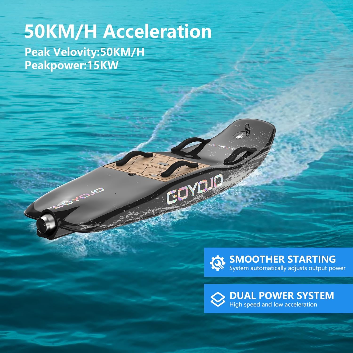 The GOYOJO electric surfboard combines cutting-edge technology with sleek design, offering riders an exhilarating water experience. Available in four editions (Beginner, Pro, Competition, and Carbon Custom), it features adjustable power from 10kW to 22kW, reaching speeds up to 65km/h (40mph). The lightweight carbon fiber edition weighs just 44lbs (20kg) with dimensions of 66×23×7 inches, while the durable polymer glass fiber models support riders up to 265lbs (120kg). Equipped with a 75AH battery, it delivers up to 90 minutes of ride time and fast charging via 220V/110V adapters. The IP68 waterproof rating ensures reliability in harsh conditions, and the triple-fin design enhances stability. Perfect for ocean adventures, this surfboard adapts to all skill levels, backed by a 1-year warranty and lifetime technical support.