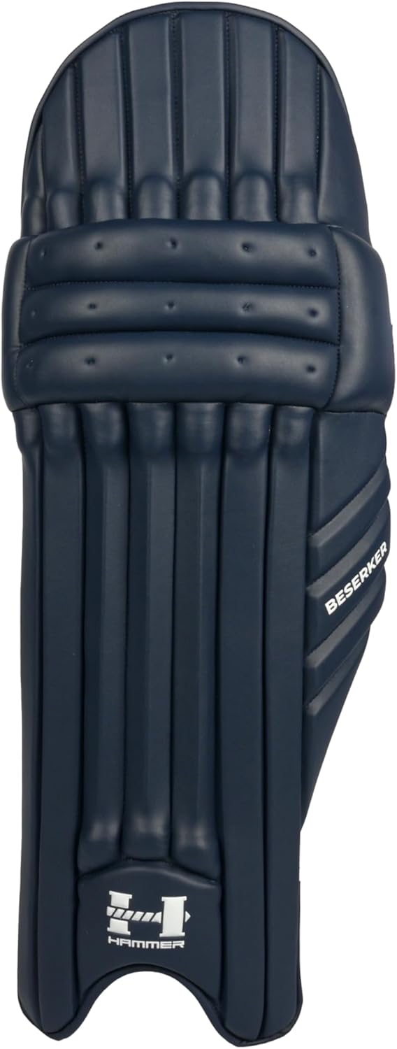 Hammer Beserker Batting Pads are engineered for unyielding protection, offering ultimate comfort and showcasing distinctive style. Designed for a dominant performance on the cricket field, they are your key to excellence. The Hammer Beserker delivers exceptional protection through its reinforced 7-cane traditional design with HD EVA construction. The three-piece knee roll and tri-flex shin bolsters provide targeted protection while maintaining mobility essential for competitive batting. Branding: Fully embossed logos in front and back, including the 'H' logo, model name, and Hammer embossing on the 'T' part, reflecting a commitment to excellence. Material: Crafted from premium quality plain and designed PU in the front and back, offering durability and protection. Straps: Equipped with three secure-fit straps, featuring embossed branding on the center strap. A small HD foam-padded portion below the strap enhances comfort. Extra padding on backside straps absorbs sweat. Front Look: Traditional reinforced 7 cane and HD EVA construction with side wing provides robust protection. The top hat is made with HD EVA for enhanced protection. Knee: Features a three-piece knee roll filled with cotton and HD EVA protection for shape retention and knee protection. Shin Bolsters: Equipped with tri-flex shin bolsters with PU and mesh on top for comprehensive protection. HD foam and a thin plastic sheet provide extra protection under the HD foam. Back Hat: Soft foam offers good protection, with lining details and the Hammer logo embossed. Back Side Knee: Features a hard plastic cup with HD foam in three sections for better comfort.