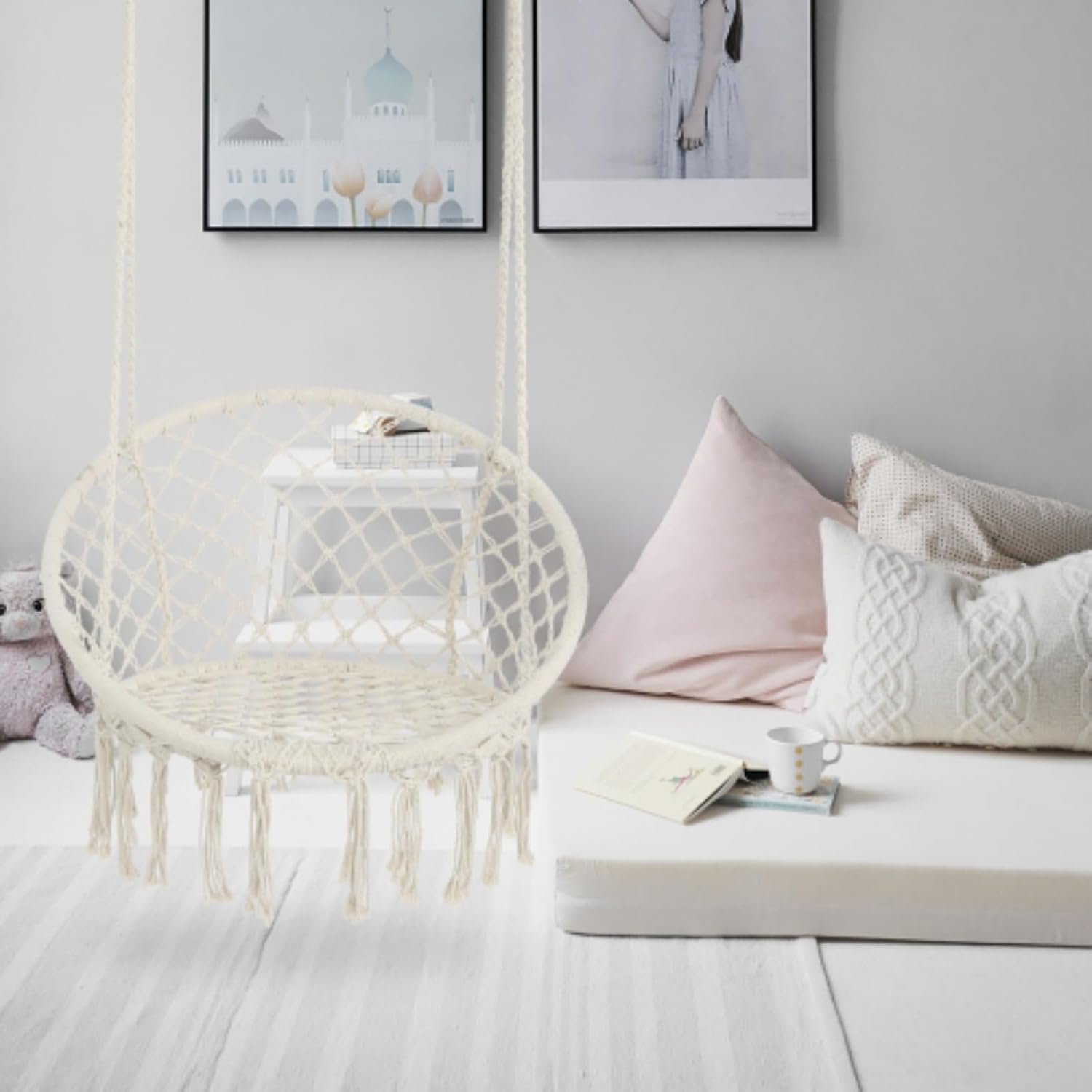 This bright and beautiful handwoven cotton outdoor hanging chair is perfect for reading and relaxing on after-lunch time. The flowing fringe gives it a bohemian style that is eye catching and comfortable. This hanging swing chair is lightweight at only 7 lb. But it has a weight capacity of 330 lb. Strong frame,thick cotton ropes and firm woven-net ensure they are not torn or damaged. This trendy hammock chair will become your favorite light cradle and swing reading chair or relaxing meditation chair. Enjoying the beautiful scenery, white clouds float over the blue sky and the warm sun filtered through the leaves, swinging in the hammock chair under the shade tree, relax, sleep, read, listen to music, or talk with friends. How pleasant is the day! Specification Material: cotton rope, hoop Maximum weight: 150 kg (about 330 pounds) Size: 31.5 X 23.6 X 47.2 inch Color:Beige Item Weight: 7 Pounds