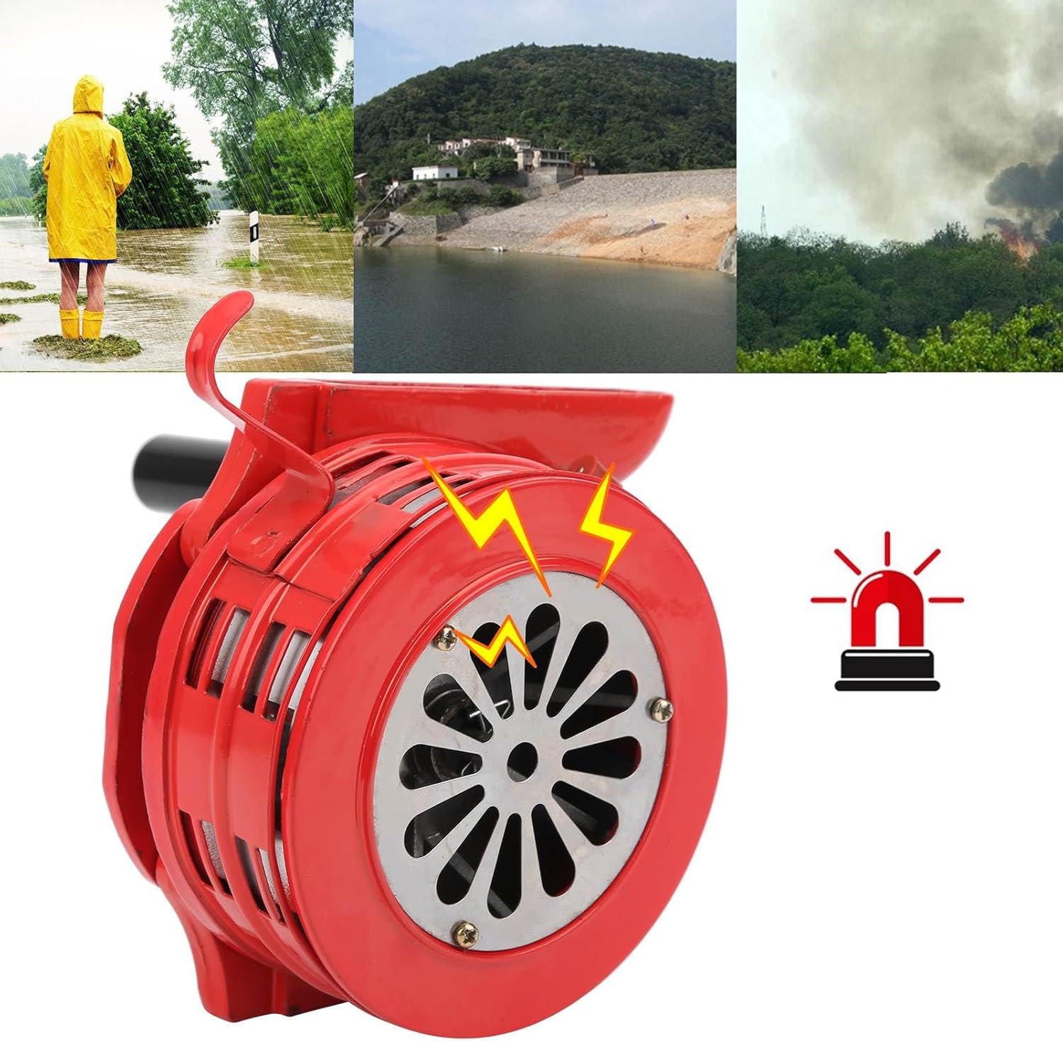 1. Hand‑held alarm, easy to operate, just turn the handle to sound the alarm. 2. The sound of the portable manual siren was so loudly that it could be heard from 1/4 mile away. 3. The housing is made of metal for maximum strength and durability. 4. Widely used in factories, schools, troops, disasters and seaside guards, etc. can effectively provide timely warnings during incidents. 5. With small size, easy to carry and store, convenient to use and with good performance. Specification: Item Type: Hand Crank Siren Type: Hand Operated Sound Type: Siren Construction: Metal Housing Size: Width: Approx. 5.51in Height: Approx. 9.09in Depth: Approx. 7.95in Decibel: 120db Size: Approx.11cm / 4.3in 23cm / 9.1in Product Description: 1. The portable alarm is a hand-cranked sounder that does not require power support. It is called differently due to local differences. 2. Including handle, gear speed increasing mechanism, slider, fixed wheel, ringing wheel, sound window cover, gear box, box frame, the handle is connected with the driving shaft of the gear speed increasing mechanism, and the output shaft of the gear increasing mechanism passes through The pin is connected with the sliding block, and the sliding block is connected with the flange of the impeller by friction . 3. There is no need for power support, and the power is provided by shaking the handle to make the alarm send out an alarm . The sound level depends on the speed of the hand. 4. In terms of and purpose, it is divided into fixed hand-operated alarm and portable hand-operated alarm. 5. Hand-cranked alarm is light in weight, easy to carry, can be detached, and the handle will sound an alarm. 6. Widely used in factories, schools, troops, special flood control, disasters, open barracks, air and other emergencies. 7. Can effectively provide timely early warning during the incident and reduce people's