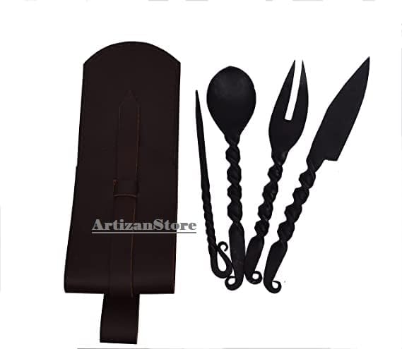 Medieval Handforged Iron Cutlery Set With Leather Pouch flatware, kitchen, spoon, skewer, fork, Knife Our skewer, fEasy to take along to the faire, a picnic, camp out or wherever you want to be able to eat out! The handle for each hand-forged piece has the traditional blacksmiths twist and the skewer is capable of holding an edge. This set is slightly heavier than our other feasting utensil set). Please clean before use; these have been heated treated and oil quenched. To minimize rusting keep oiled. Set Of 4.............