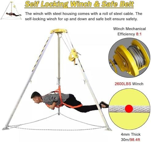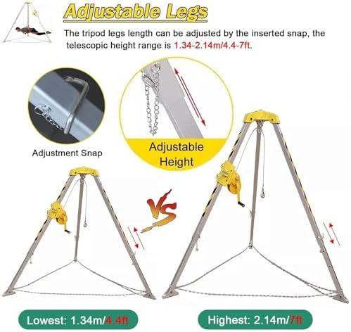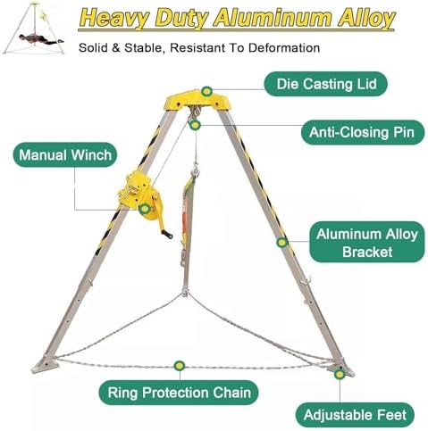 Are you concerned about safety while working in high places, confined spaces, or near cliffs? Our Confined Space Rescue Tripod is specifically designed to provide peace of mind in emergency situations. This essential rescue tripod system enables rescuers to conduct operations effectively, ensuring the safety of individuals in distress. Key Features: - **Adjustable Angled Feet**: Perfect for installation in wellheads, pits, and uneven terrains, making it versatile for various environments. - **Efficient Lifting**: Ideal for lifting, lowering, and positioning personnel and materials safely in confined spaces. - **Durable Winch**: Designed for reliable lifting and lowering, enhancing safety during rescue operations. - **Lightweight & Foldable**: Easily portable, this design allows for convenient storage and transport, ideal for emergency responders on the go. - **Safety Chain**: Provides additional support for demanding applins, ensuring a secure rescue process. - **Telescopic Support Leg**: Height can be adjusted to fit different scenarios, making it adaptable for various rescue situations. - **Widely Used**: Trusted by firefighting teams, municipal services, and rescue nizations, this tripod is a must-have for safety professionals. - **Fall Protection**: Features a double protection system for added safety during operations. - **Ring Protection Chain**: Prevents slipping, further enhancing the reliability of the system. Specifins: - **Material**: Heavy-duty Aluminum Alloy for long-lasting durability. - **Wire Cable Length Options**: Available in 20m/66ft and 30m/98ft. - **Adjustable Height**: Ranges from 1.34m to 2.14m (4.4ft to 7ft). - **Winch Efficiency**: Available with a 5:1 or 8:1 mechanical advantage. - **Rated Load Capacity**: Choose from 1200LBS (200KG), 1800LBS (300KG), or 2600LBS (400KG) safe load options. Package Includes: - 1 x Complete Rescue Tripod Kit (Includes winch, cable, safety belt, and more). Note: Slight variations may occ