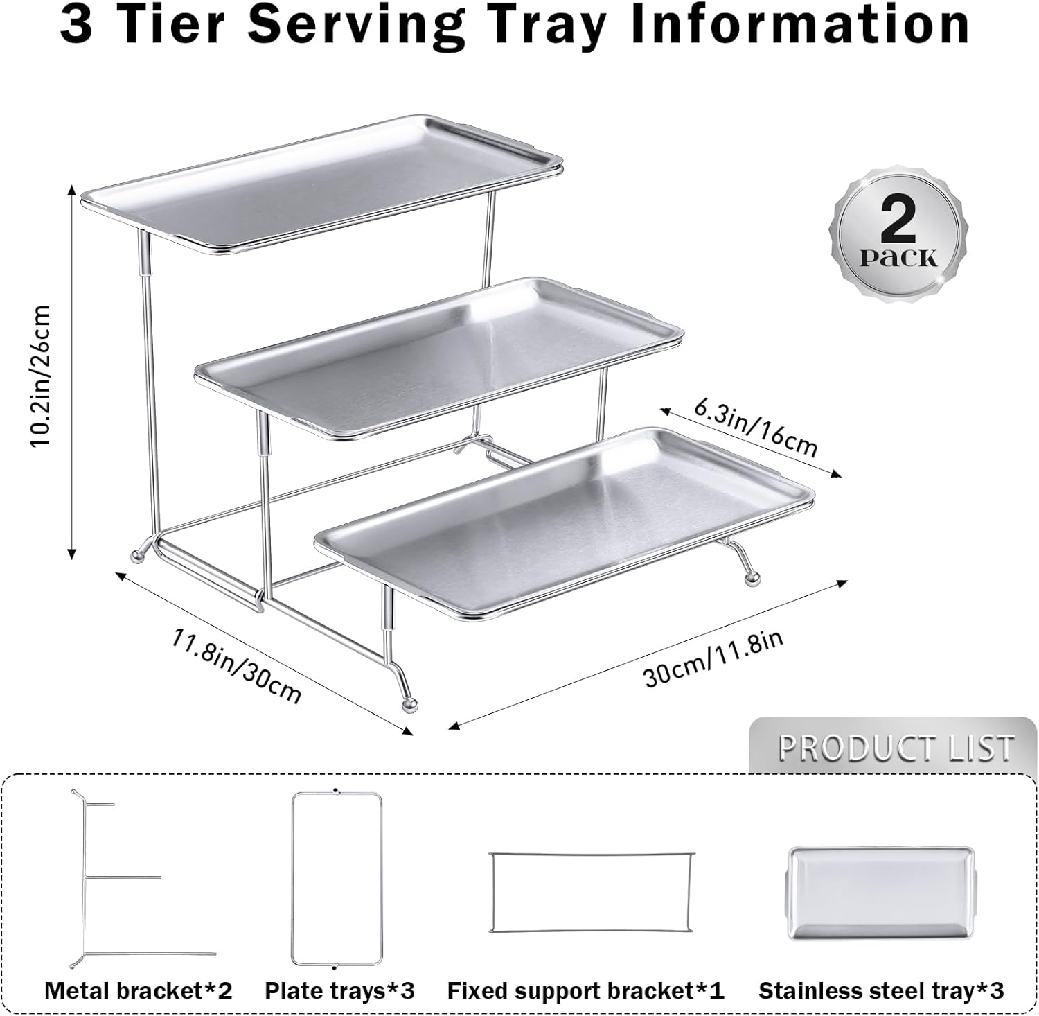 Feature: Multiple uses: This dessert table tray set to showcase your signature cakes, cookies, appetizers, and whatever else you can cook up. With a sturdy design and an attractive appeal, the tiered stand is suitable for events, theme, or decoration. Sturdy feature: This treat trays for dessert table is thicker, does not wobble and is more versatile than any other stand on the market. You can swivel this stand to display in a wide variety of ways to fit tight spaces. Specifications: Material: 3 layer tray: stainless steelBracket: metalQuantity: 2 piecesColor: silverSize: about 6.2 x 11.8 inches/ 15.75 x 29.97 cmPackage includes: 2 x tiered serving standNotes: Please allow a little error on the size due to manual measurement. The color might exist slight difference due to different displays.