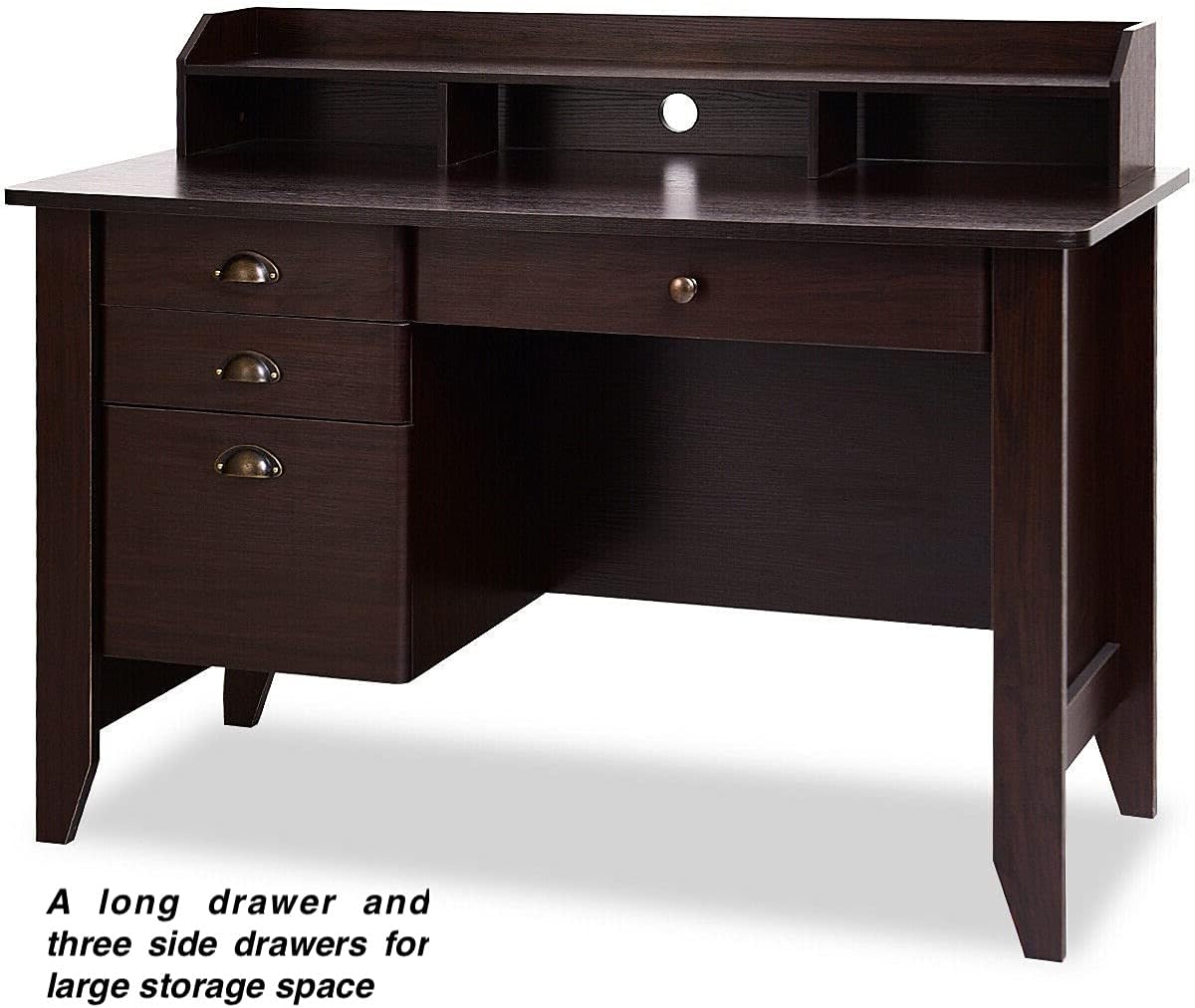 This is our brand new computer desk, which is a perfect furniture for your home or office and provides you with a unmatched convenience. The engineering MDF construction provides years of sturdy and reliable use for you. It features a smooth slide-out long drawer and three spacious side drawers, offering large storage space for your daily supplies. A desktop shelf provides more storage space for books, photo frame or cups. Enjoy your writing with this practical and elegant desk. Specifications Color: Brown Material: MDF Overall size: 47.5"L×22" W×36.5" H Workstation dimension:47.2"Lx 21.7"Wx29.1” H Dimension of top shelf: 43.3"L x 7.3"W Dimension of left drawer: 22.8"L x 13.4"W x 2.2"Deep Dimension of right &upper drawer: 12.0"Lx 13.4"Wx 2.2"Deep Dimension of right &bottom drawer: 12.0"Lx 13.4"Wx 5.3"Deep Package includes 1 x Computer desk 1 x Instruction Note Please refer to the dimension and size of the product before purchasing.