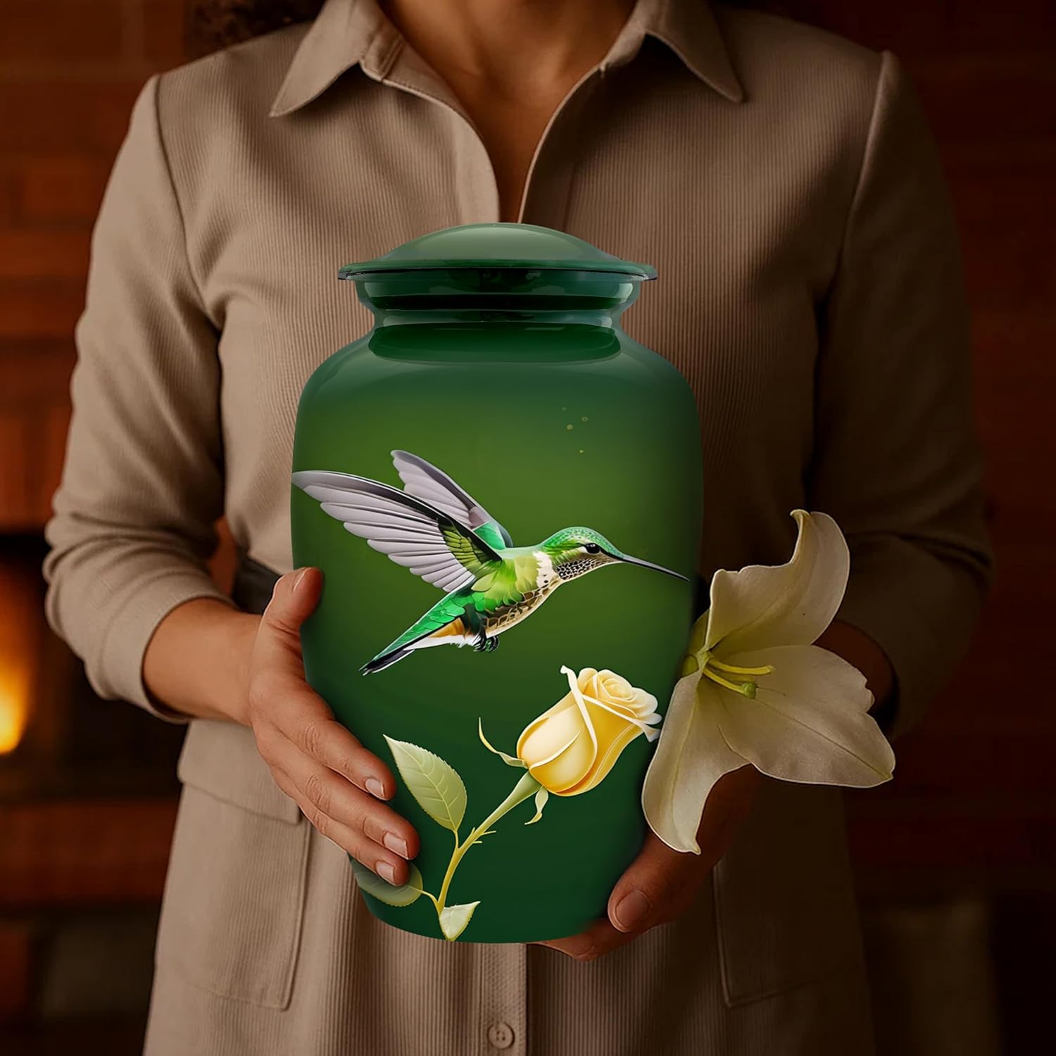 Celebrate a life well-lived with this Hummingbird Cremation Urn for Adult Human Ashes, a beautifully handcrafted tribute designed to honor your loved one with grace and dignity. With a 200 cubic inch capacity, it is suitable for holding the full ashes of an adult weighing up to 200 lbs. Inspired by the symbolism of the hummingbird—often seen as a messenger of hope, healing, and resilience—this urn offers a peaceful and meaningful resting place. The delicate floral and bird design reflects love, freedom, and eternal remembrance, making it ideal for commemorating a parent, spouse, or cherished friend. Crafted with care, each urn is unique, finished with vivid detailing and a smooth surface that’s perfect for display at home, in a niche, or during a memorial service. A secure threaded lid ensures the ashes remain safely sealed, while the durable build offers lasting beauty and protection.