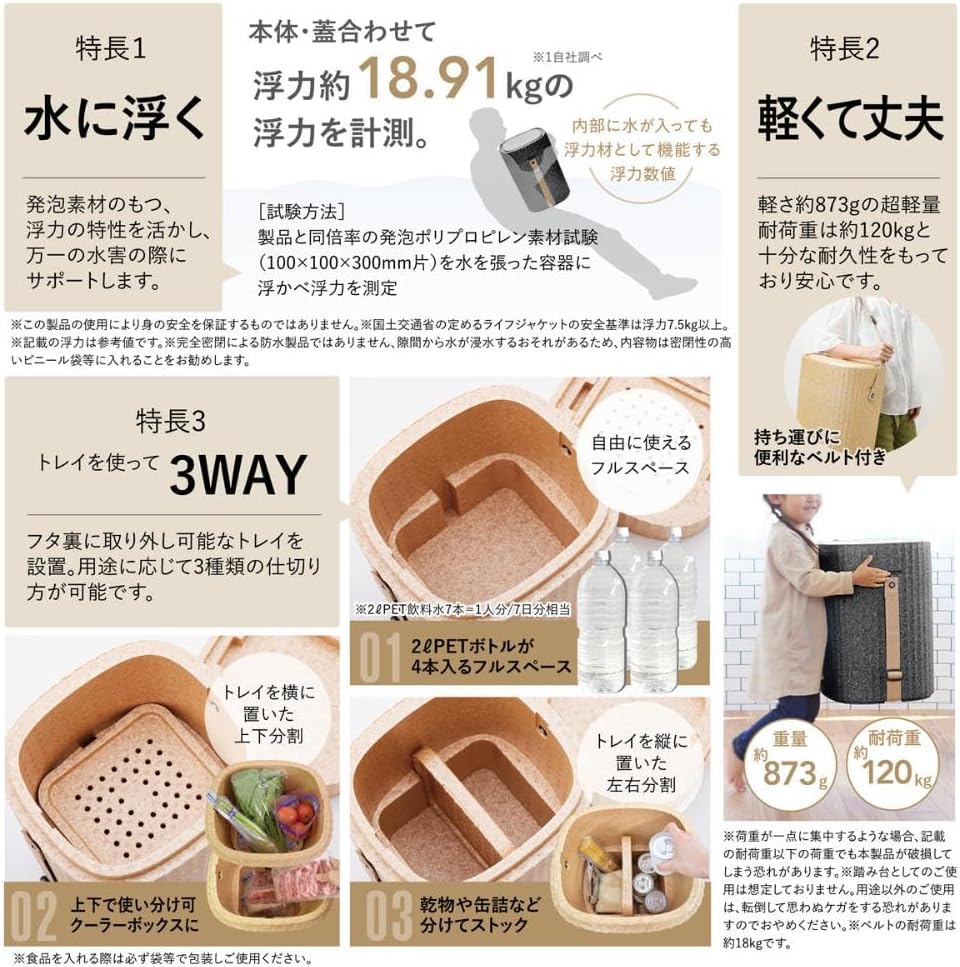 Disaster prevention interior for disasters that may be visited someday. You can put it outside in your entryway, bedroom, kitchen, or use it as a stool, or use it as a cooling box for everyday use. Store emergency supplies and emergency water close to you. In times of emergency, it can also be used as a temporary evacuation for food. With a load capacity of about 264.6 lbs (120 kg), you can sit with confidence. When using an ice packet, it will keep under 14°F (10°C) or below 8 hours at 10°F (40°C). This phase free product is 35.9 lbs (18.9 kg) of buoyancy that makes it a floating device in the event of water damage. Main unit weighs approximately 2.9 oz (873 g), and comes with a shoulder strap for easy carrying.