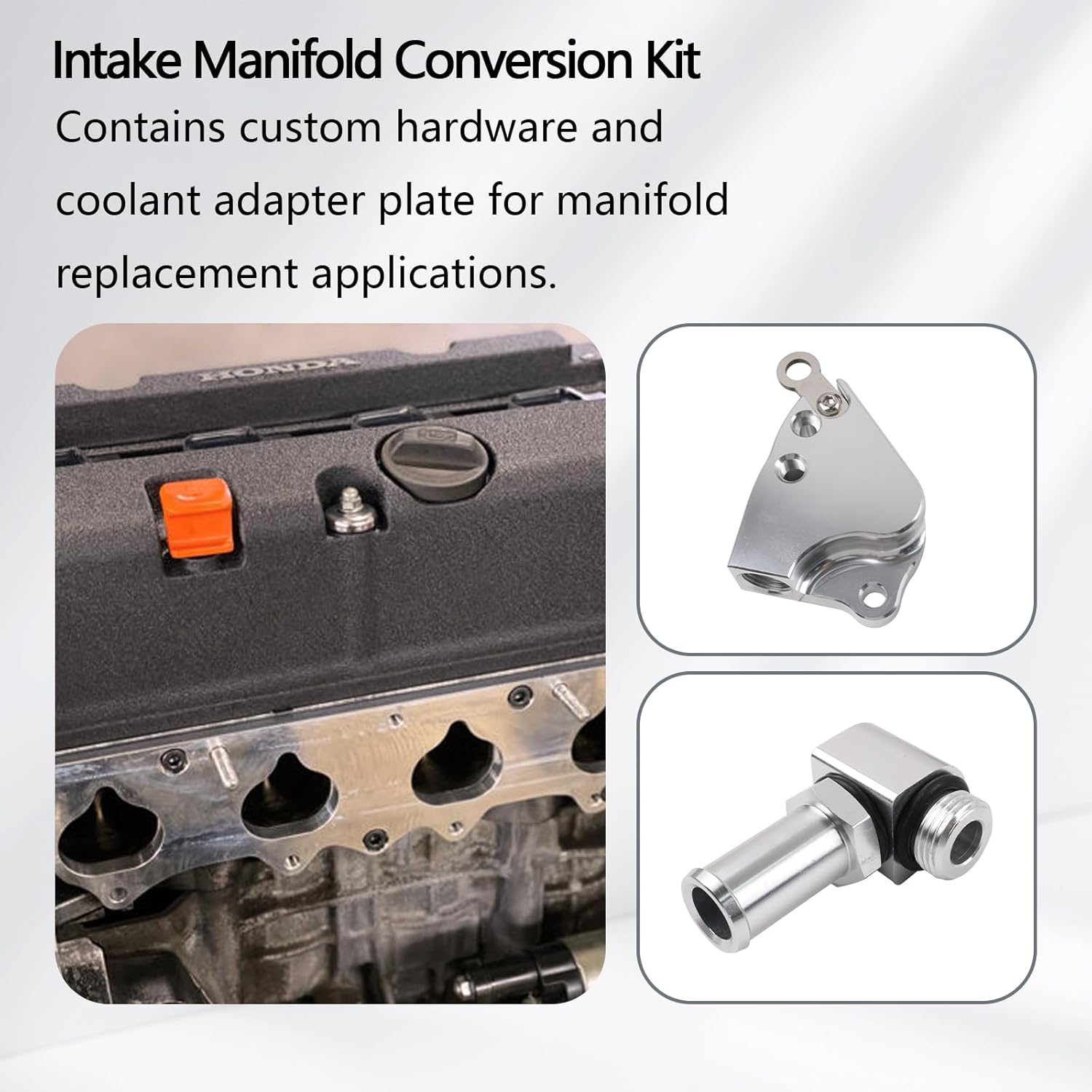 This intake manifold adapter kit allows the use of an S2000 F20C/F22C intake manifold on K24, K24A, and K20A3 cylinder heads. Made from billet aluminum, the kit includes necessary hardware and a coolant adapter plate. Modification of the S2000 intake manifold is required for installation.