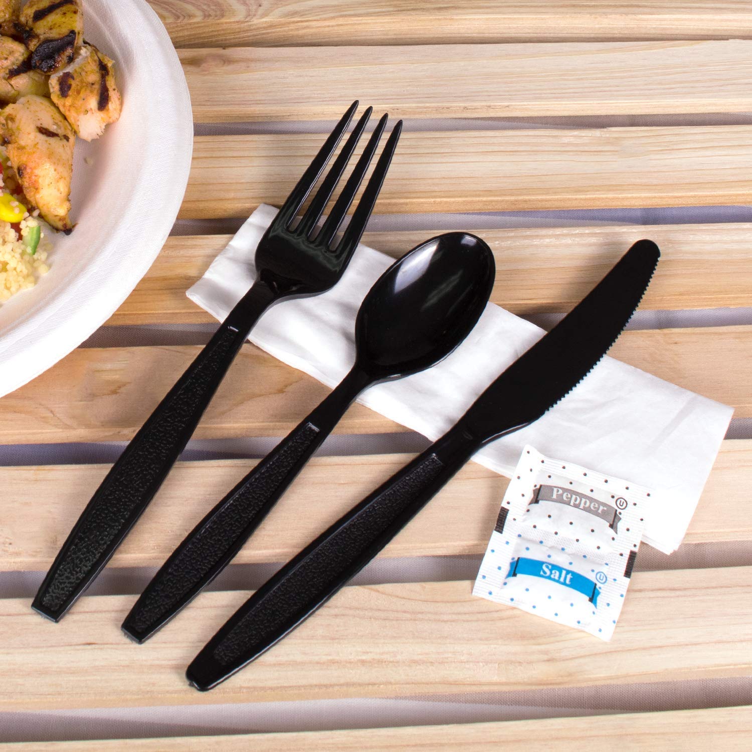 Karat cutlery kits come in a variety of options to allow you to quickly send your customers to-go with all of the essentials. Need more than just utensils? These kits some with a salt packet and a pepper packet to allow customers to season their food to their desired taste. Each kit comes individually poly wrapped with a black heavy weight PS knife, fork, and tea spoon in addition to a single ply napkin, a salt packet, and a pepper packet.