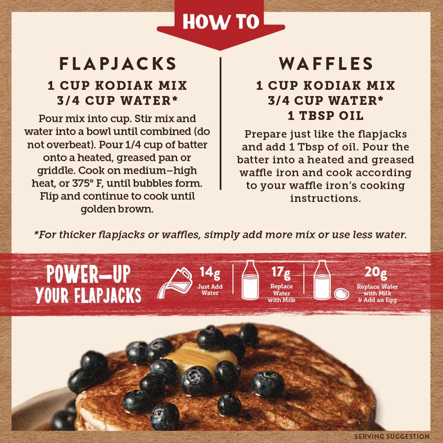 This highly requested Kodiak Blueberry Power Cakes® Flapjacks & Waffle Mix delivers flavor straight from nature to your home. It’s tart from the start! No need to add your own blueberries to mix—or protein and whole grains for that matter—this box has it all.