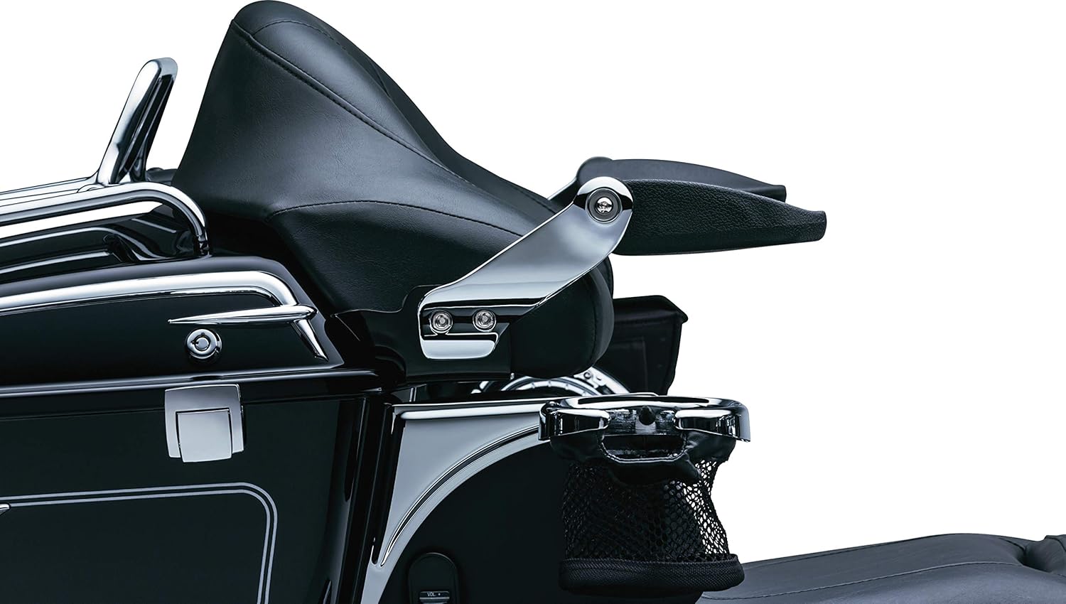 The chrome Kuryakyn Stealth Passenger Armrests sleek design shines with ultimate comfort & convenience in a compact, sturdy package! The support brackets are nearly invisible & fastened between Tour-Pak lid & pad and each arm has two mounting locations & pivot has an adjustable stop for fine tuning pad position. Parts Included: (1) Right-Side Armrest Assembly, (1) Left-Side Armrest Assembly, (1) Right-Side Mounting Bracket, (1) Left-Side Mounting Bracket, (1) Right Backer Plate, (1) Left Backer Plate, (1) Right Mounting Plate with Studs, (1) Left Mounting Plate with Studs, (1) Hardware kit containing:, (6) 1/4” flat washers, (6) 1/4” nylock nuts, (4) 5/16”-18 X 5/8” socket head cap screws, (2) foam pads, (4) 5/16” hi-collar lock washers, (2) #6-32 X 1/4” set screws. Suggested Tools (not included): Set of combination wrenches, socket set and ratchet, set of hex wrenches, drill and drill bit set, center punch, marker. The Kuryakyn Stealth Passenger armrests are compatible with Harley: '97-'13 Electra Glides (except '10-'13 FLHTCUSE), Road Glides (except '11 FLTRUSE), Road Kings, Street Glides, Tour Glides & Trikes Equipped with King or Ultra Tour Pak.