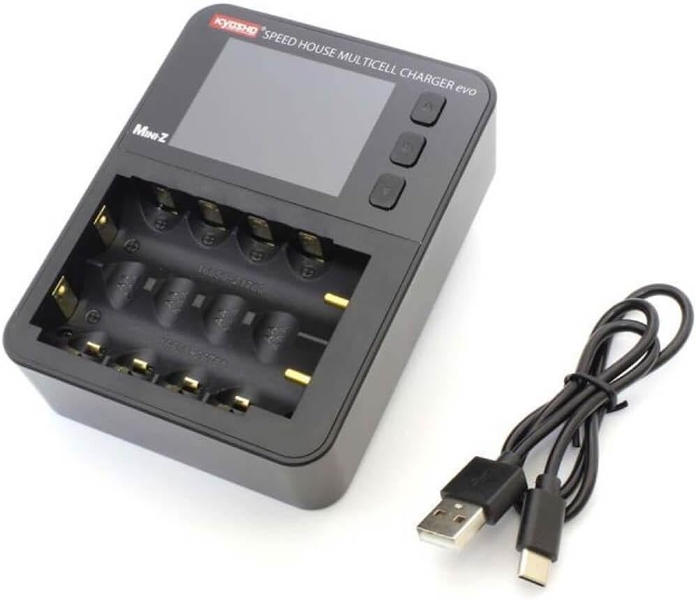 The MINI-Z Charger EVO is a compact size charger that fits in the palm of your hand, yet it is a multifunctional charger / discharger that is ideal for MINI-Z, covering everyone from users who enjoy MINI-Z as leisure to race users who want to maximize battery performance. Its most distinctive feature is that it is equipped with a total of five operation modes, charging / discharging / cycle / analysis / activation, which are suitable for battery charging / discharging and management. The (maximum 1.5A *) / discharge current (maximum 1.0A *) / delta peak cutoff voltage (3mV to 15mV) can be set arbitrarily. In addition, these settings are not canceled unless the charger is turned off, and are applied to all slots, eliminating the need for troublesome settings each time charging and discharging are performed. The input power terminal uses USB Type-C, which is easy to supply from a mobile battery. (Quick Charge or Power Delivery is recommended) It is a multi-cell charger equipped with various other functions, but it has various protection functions such as reverse connection protection / overtemperature protection circuit / overcapacity protection function, and the battery just by inserting the battery into the slot. Since it has a function that automatically detects the type and automatically starts charging (when the setting is not changed manually), even beginners can handle it with confidence. * When using a AAA nickel metal hydride battery. Original function only for SPEED HOUSE * Charging capacity can be set and charging can be completed when the battery is charged to the specified capacity. * Charging can be completed when the charging voltage is set and the voltage is charged to the specified voltage. * Record the average discharge voltage during discharge. By setting the discharge time arbitrarily, it is possible to select batteries with s
