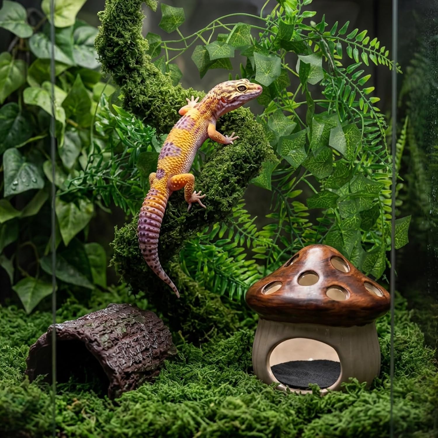 PRODUCT FEATURE The solid tree-house hide provides a safe shelter that helps leopard geckos feel secure. Flexible mossy vines (100 cm) and mossy grass mounds create climbing paths, promoting animal activity, exploration, and daily routines within the enclosure.The mushroom feeding bowl adds an interactive feeding spot, encouraging foraging behavior and making snack time more engaging while keeping food contained.PRODUCT CONTENT Leopard Gecko Tank Accessories Kit PRODUCT SPECIFICATIONMaterial : Quantity :6 PCSColor :green