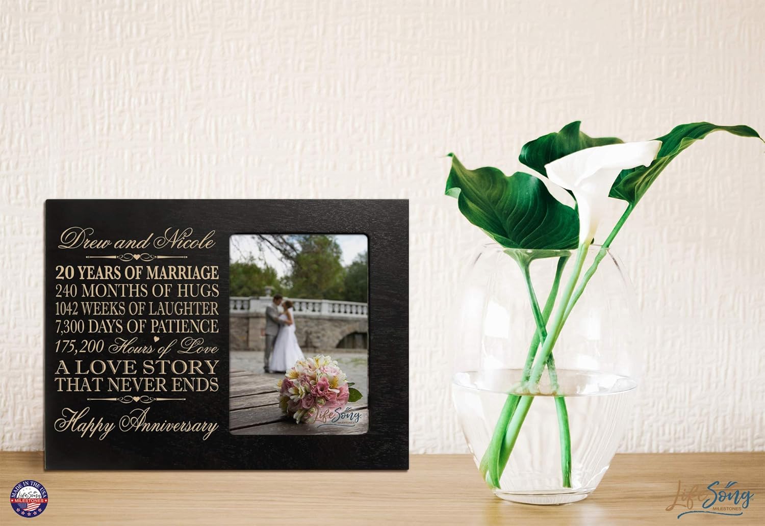 Honor the happy couple with a personalized 20th wedding anniversary photo frame. A treasured and lasting personal keepsake for wedding or anniversary. 20th Anniversary picture frame can be hung on wall or displayed on table. This special keepsake anniversary gift will always be a wonderful reminder of the love that you have for one another. Honor the happy couple with a fifteen year wedding anniversary decorative wood photo frame holds 1- 4x6 photo. Words are laser engraved.