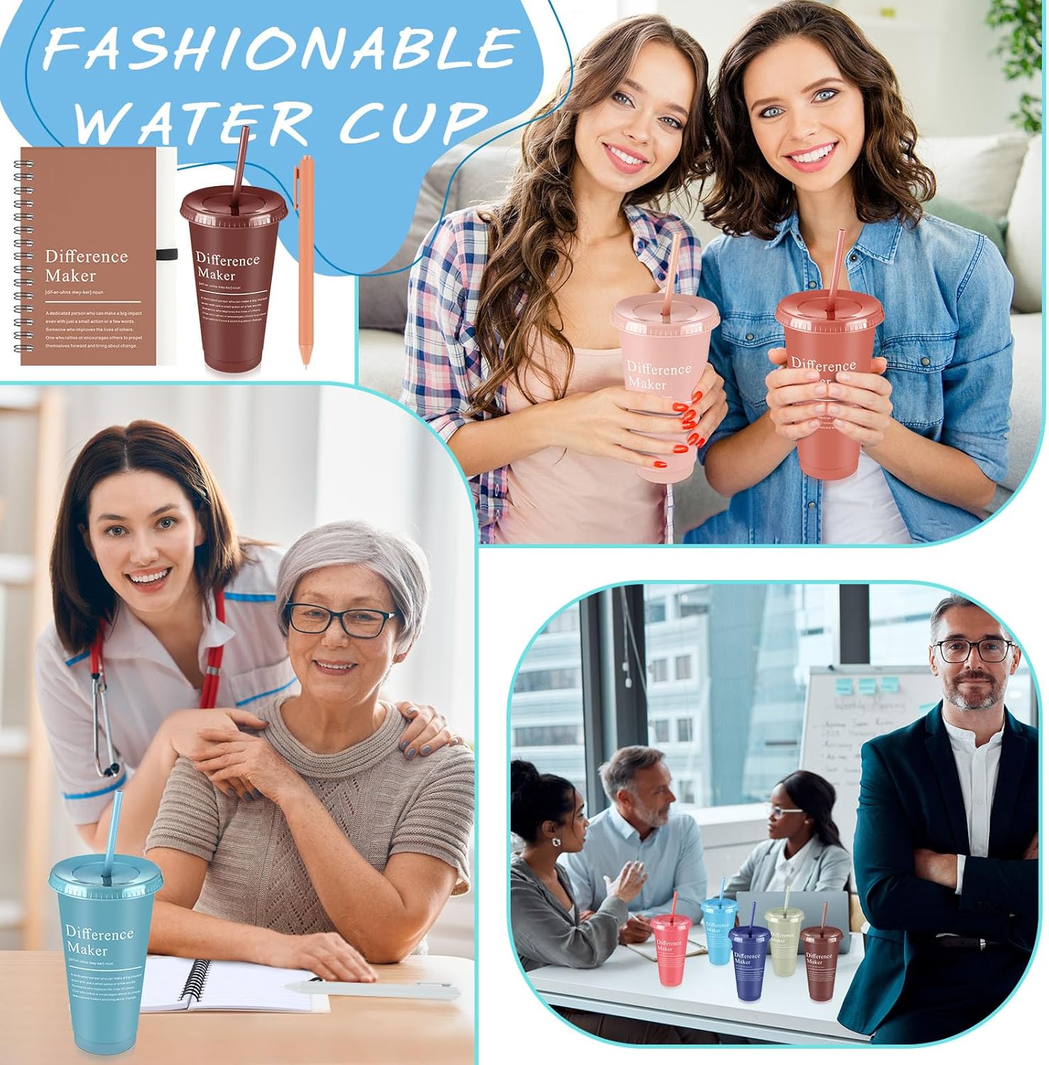 Features: Perfect for any uplifting moment: designed for graduation, staff events, Mother's Day, and workplace celebrations. Whether shared at team meetings or care packages, this set brings heartfelt value to every recognition moment. The plastic cups are approx. 24 oz in capacity, proper size for holding beverages, wine, beer, cocktails, champagne, water, juice, coffee, tea, milk and more, and the stylish design make it more charming and eye catching. Specifications: Material: paper, PP plastic Color: colorful Capacity: approx. 24 oz Size: Cup: about 3.94 x 6.89 x 9.84 inches /10 x 17.5 x 25 cm Notebook: about 4 x 5.5 inches/10 x 14cm Pen: about 5.63 inches/14.3 cm Package includes: 20 x Inspirational plastic cups 20 x Difference maker notebooks 20 x Pens Notes: Manual measurement, please allow slight errors on size. The color may exist a slight difference due to different screen displays