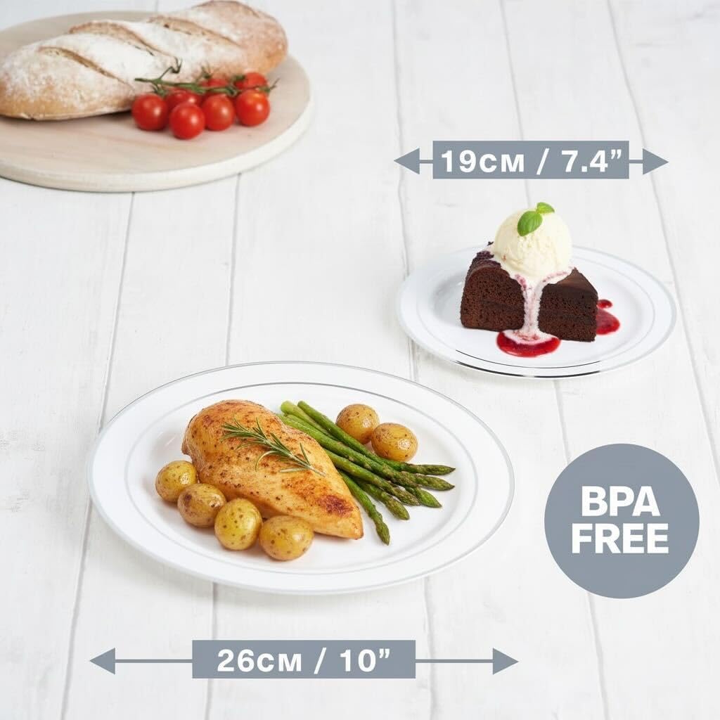 Create a memorable dining experience with our elegant 120 piece white plate set. Featuring an elegant silver trim, these plates add a touch of glamour and sophistication to any table, leaving your guests impressed. Our set includes 60 dinner plates and 60 dessert plates, providing plenty of options for serving a variety of dishes, appetizers and desserts. Whether you are hosting a formal event like a wedding, reception or birthday, or a casual get-together like a christening, baby shower or Christmas party, our plates are perfect for any occasion. Made from premium materials, our plates are strong, sturdy and fully heat resistant, making them durable and reusable. They can be used multiple times, making them an eco-friendly and sustainable choice for your party supplies. We are confident that you will love our plates, which is why we offer a 100% satisfaction guarantee. If for any reason you are not satisfied with your purchase, our friendly customer service team is always ready to help.