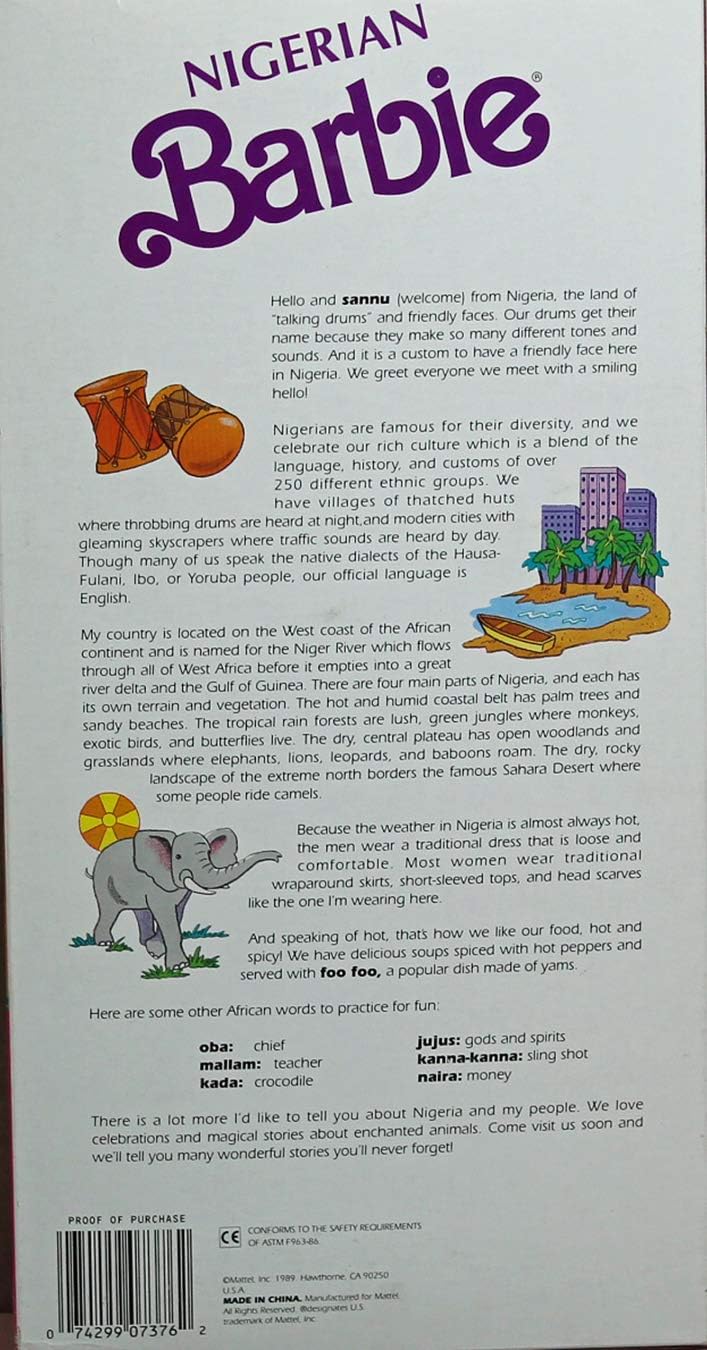Nigerian Barbie Dolls of The World First Edition Mattel #7376 Hello and sannu (welcome) from Nigeria, the land of 'talking drums' and friendly faces. Because the weather in Nigeria is almost always hot, the native people dress in light clothing. Nigerian Barbie doll wears a brown, beige, and black swirled dress with golden accents. She also wears golden armbands and matching slip-on shoes. Her black hair is pulled slightly away from her face, and tied with a matching head-scarf.