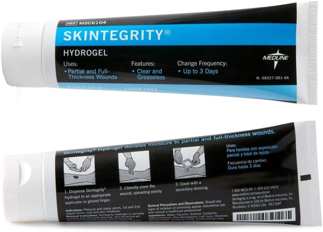 This Skintegrity Hydrogel is ideal for cleaning wounds and helps create a moist wound environment. The gel has a balanced formulation that creates easy irrigation. Indications: pressure ulcers, partial and full-thickness wounds, leg ulcers, surgical wounds, lacerations, abrasions and skin tears, and first- and second-degree burns. Contraindications: patients with a known sensitivity to components of the gel and heavily draining wounds. May be left in place for up to 3 days; Dressing change frequency will depend on amount of drainage.