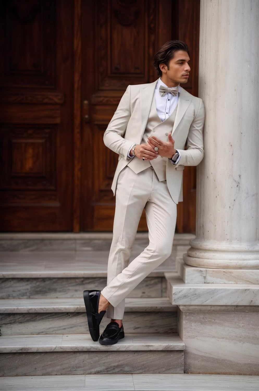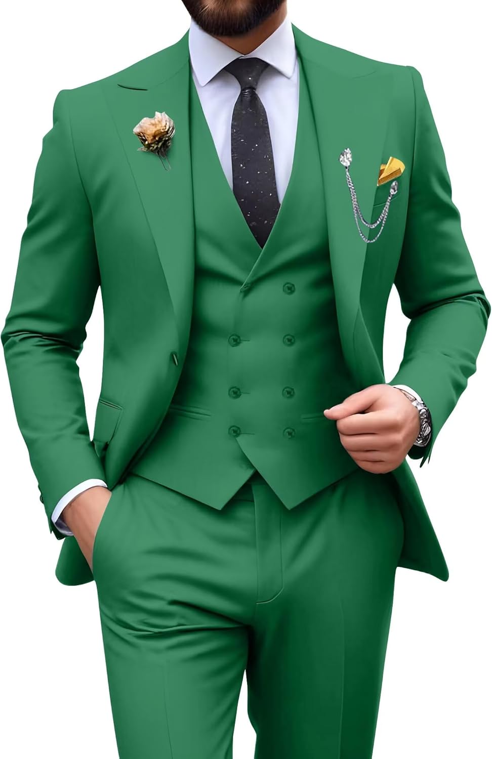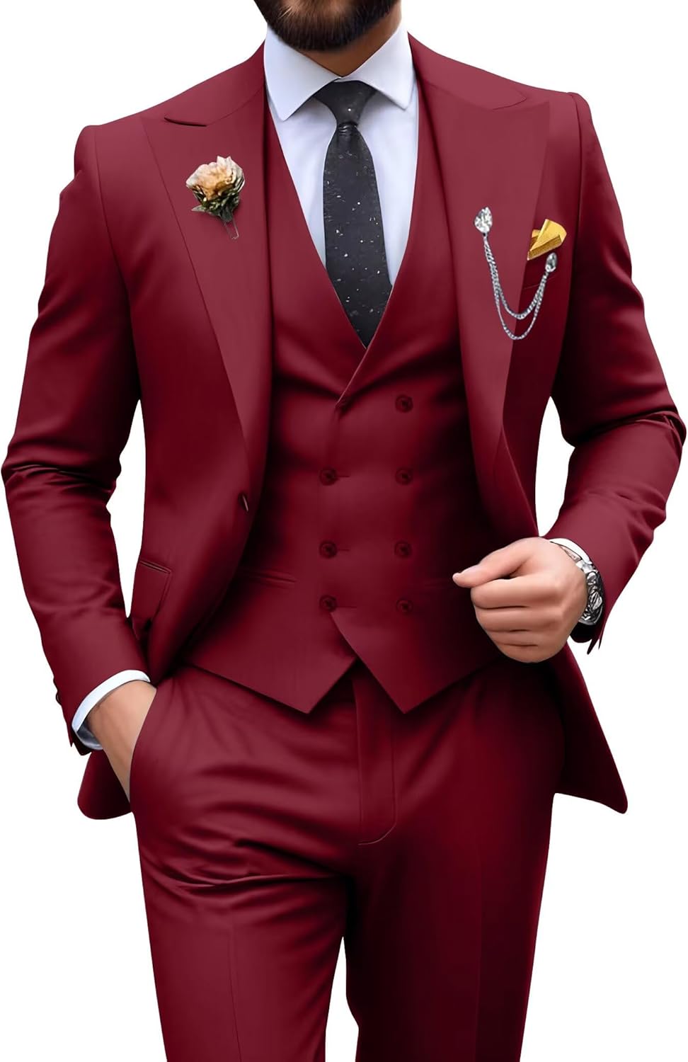 Mens Suits Slim Fit 3 Piece and Tie Double Breasted Suit Men Formal Business Blazer Vest Pants Tie Set ● Fabric: 80%Polyester+20%Viscose. ● Design: Blazer: Peak lapel collar, 3 functional pockets; Vest: Double-breasted, V-neck, adjustable back strap; Pants: Zipper closure, 2 angled slash pockets, elastic waist. ● Wash Instruction: Dry cleaning only/Do not bleach/Steam ironing availableIMPORTANT TIPS About Size ● Our Suit Size: XS, S, M, L, XL, 2XL, 3XL, 4XL, 5XL, 6XL. ● PLEASE NOT look at the Amazon size chart. Please contact us via amazon if you need customized, then send us all measurements that listed Below(The measurement guide pictures are in the left picture of the product) ● Customized Size (Units CM or Inches): A: Chest circ. B:Shoulder circ. C.waist circ. D:hip circ. E:pants outside length. F: Inseams. G:Height. H:Weight=_kg or poundsEasy to match, suitable for many occasions: ● Still struggling to find a formal suit set? This 3-piece men's suit set has the answer! Meticulously tailored with exquisite design, it offers comfortable wear and showcases your exceptional style, sure to receive many compliments!