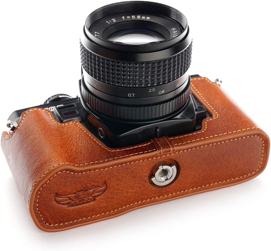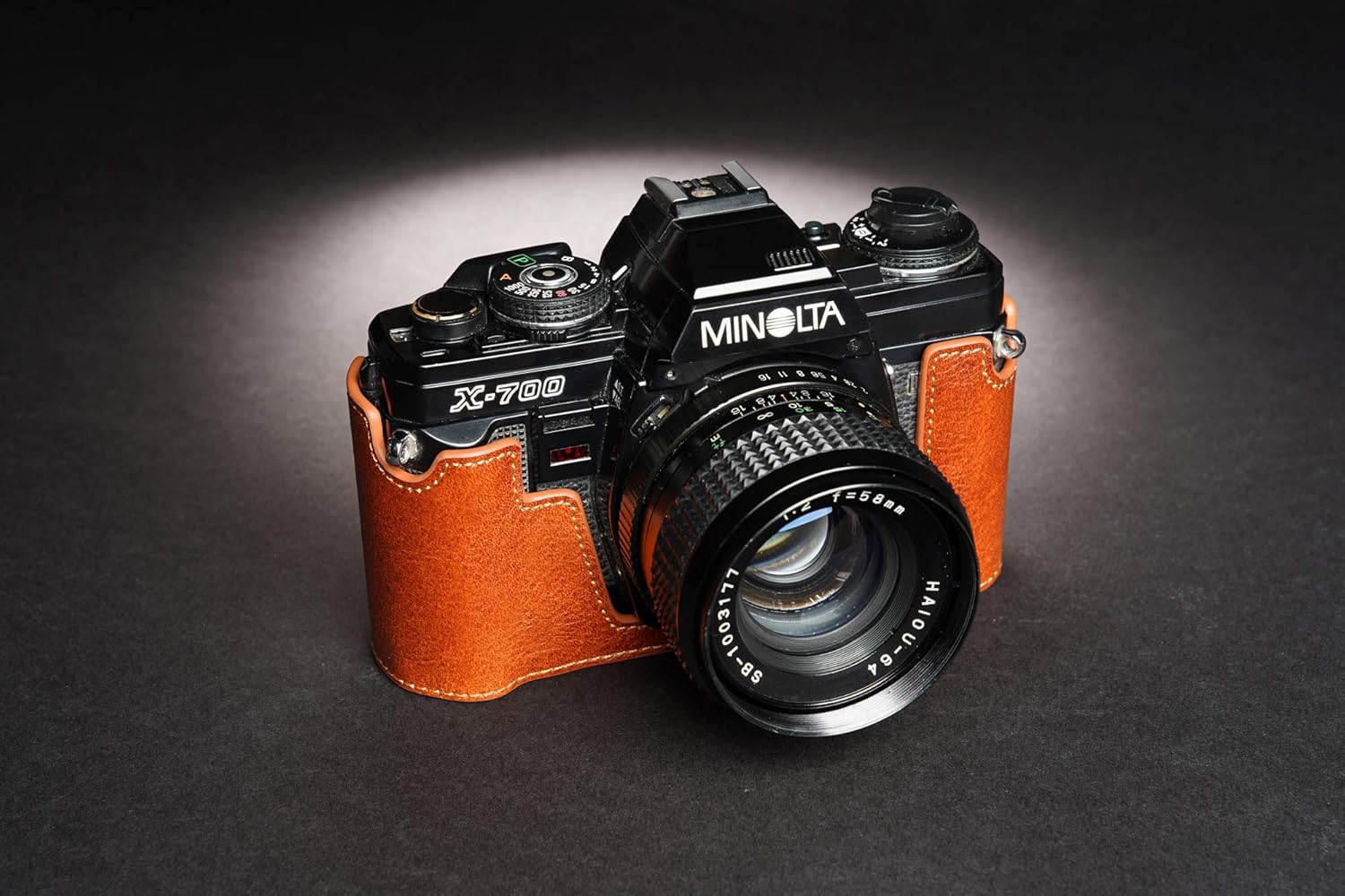 This camera is made by real top layer oil leather, the design is simple and vintage, use Metal sizing techniques make it very fit with the camera body. Inside lining use high lever velvet to protect camera body for scratch and coloration. Under base screw is made by copper and it can easy take off by coin. You don't need to take off the half case when you use tripod. It has a special design for Minolta X-700 which makes it easy to turn over the Screen and it will totally not affect screen rotation. You don't need to take off the half case when you connect data lines. Content: 1 x camera half case, 1 x Free Genuine Real Leather Hand Strap, camera not included. Material:Genuine leather.