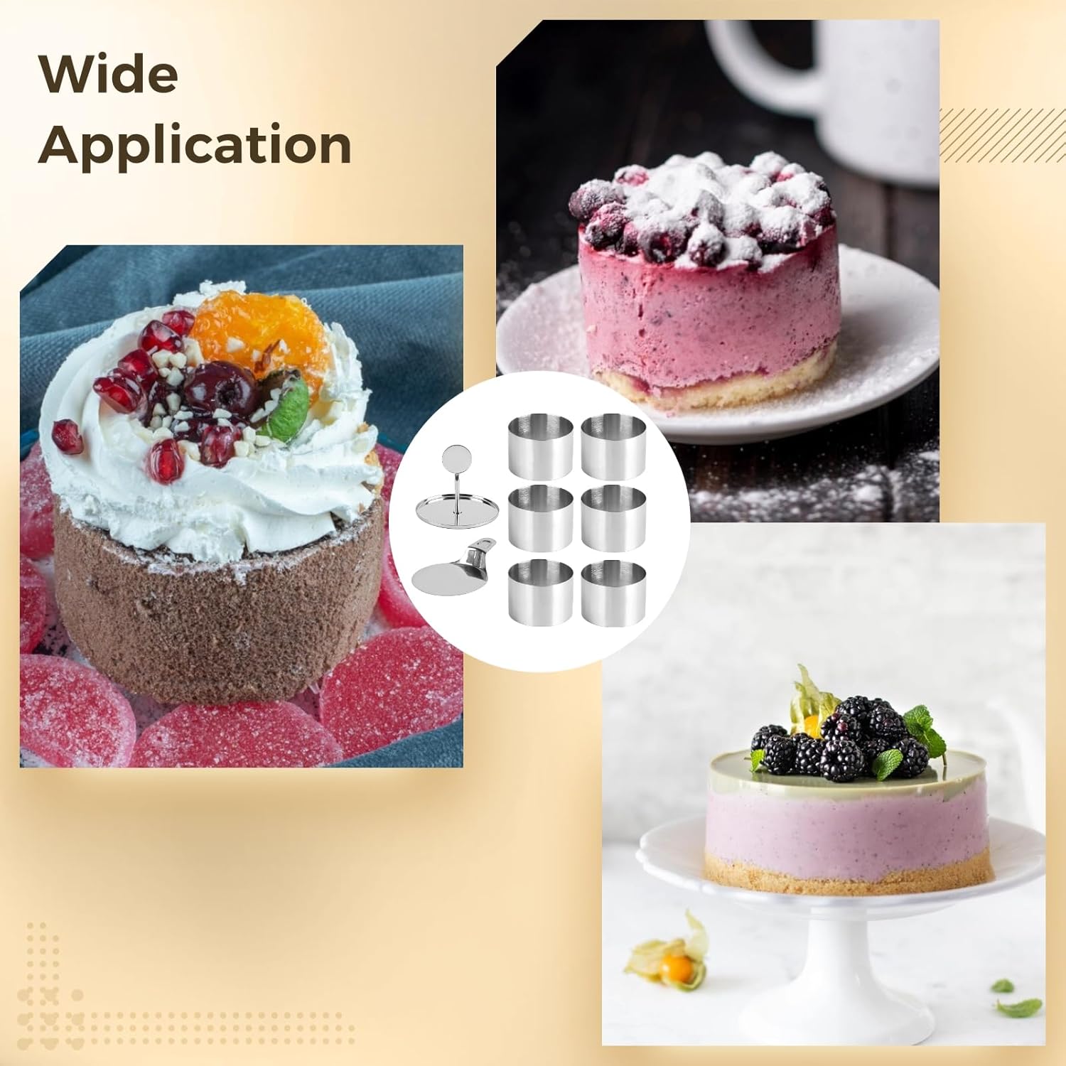 Color: silver Material: stainless steel Product Size: Ring mold: diameter: 2.95 in / 7.5 cm, height: 2.17 in / 5.5 cm, press plate: diameter: 2.83 in / 7.2 cm, height: 2.36 in / 6 cm, tray: diameter: 3.38 in / 8.6 cm Package Includes: Mold*6, pressure plate*1, pallet*1 Note: - Please refer to the measurement. Tiny measuring error is allowable in normal range. - There might be a little color difference due to the monitor, camera or other factors, please refer to the physical item.