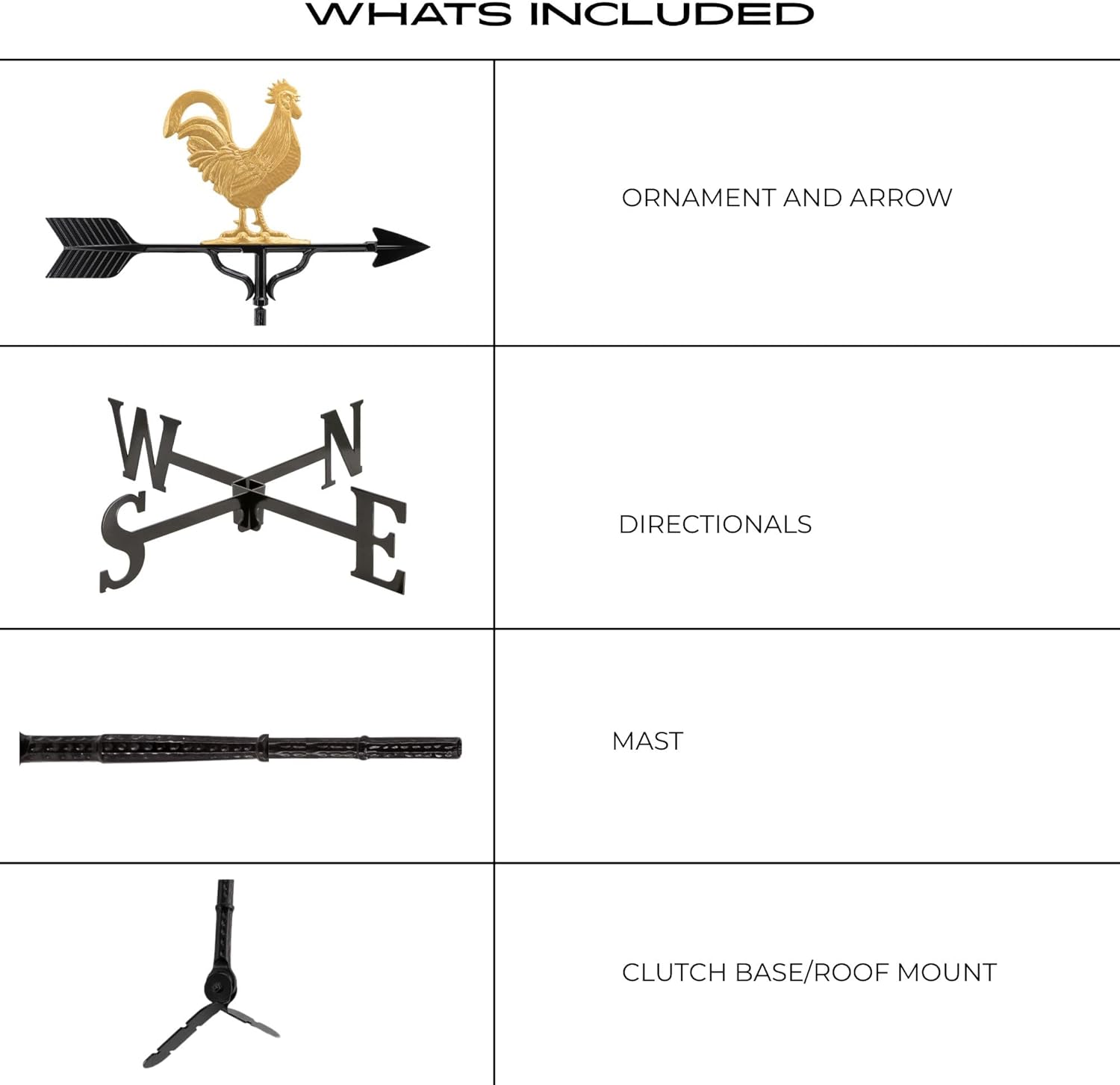 32" cast aluminum weathervane. The mast, directional letters and arrow are finished with a baked on satin black enamel finish for extra durability. This weathervane is recommended for use on a 24" - 30" cupola, two car garage or medium size home.