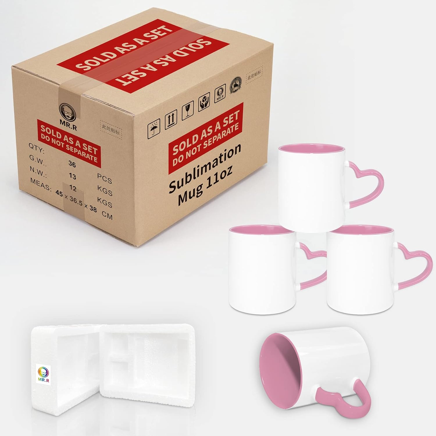 MR.R 11oz Ceramic Coffee Mug, 36PCS Set, Sublimation Blank, Pink, Modern Heart Design, Dishwasher Safe, Reusable