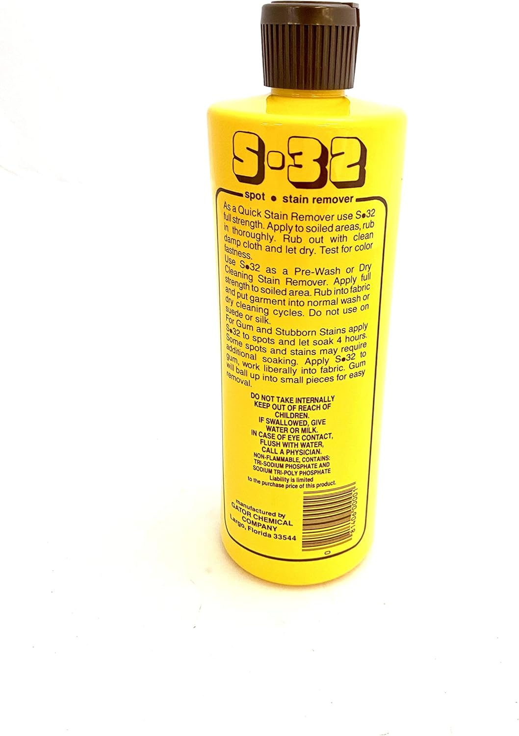We all need to get rid of nasty stains once in awhile. S-32 is an awesome stain remover that covers an array of spots and stains.It is used as a mildew stain remover, a food stain remover, a blood stain remover, an ink out stain remover, a nicotine stain remover and so much more.S-32 is a stain remover for couches, carpet stains, pet stains, most ink stains, lipstick stains, oil stains, perspiration, medicines, tar, shoe polish, cosmetics, crayon, pencil, beverages, juice, smoke film, glue, tobacco, and more.Directions:As a Quick Stain Remover test for color fastness. Use S-32 full strength. Apply to soiled areas, rub in thoroughly. Rub out with clean, damp cloth and let dry.As a Pre-wash or Dry Cleaning Stain Remover test for color fastness. Use S-32 full strength. Apply to soiled areas, rub in thoroughly. Rub out with clean, damp cloth and let dry.For Gum and Stubborn Stains apply S-32 to spots and let soak 4 hours. Some spots and stains may require additional soaking. Apply S-32 to gum; work liberally into fabric. Gum will ball up into small pieces for easy removal.