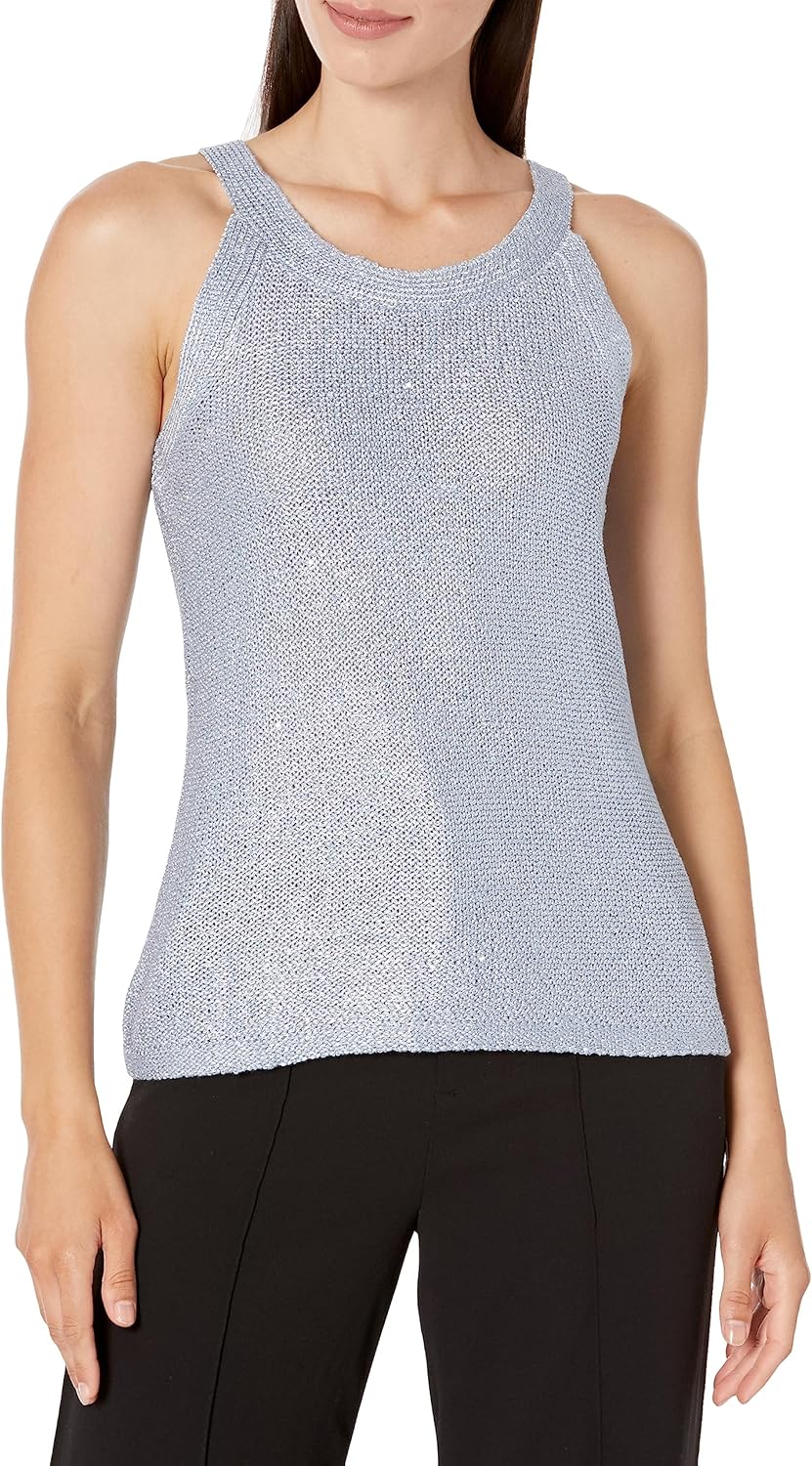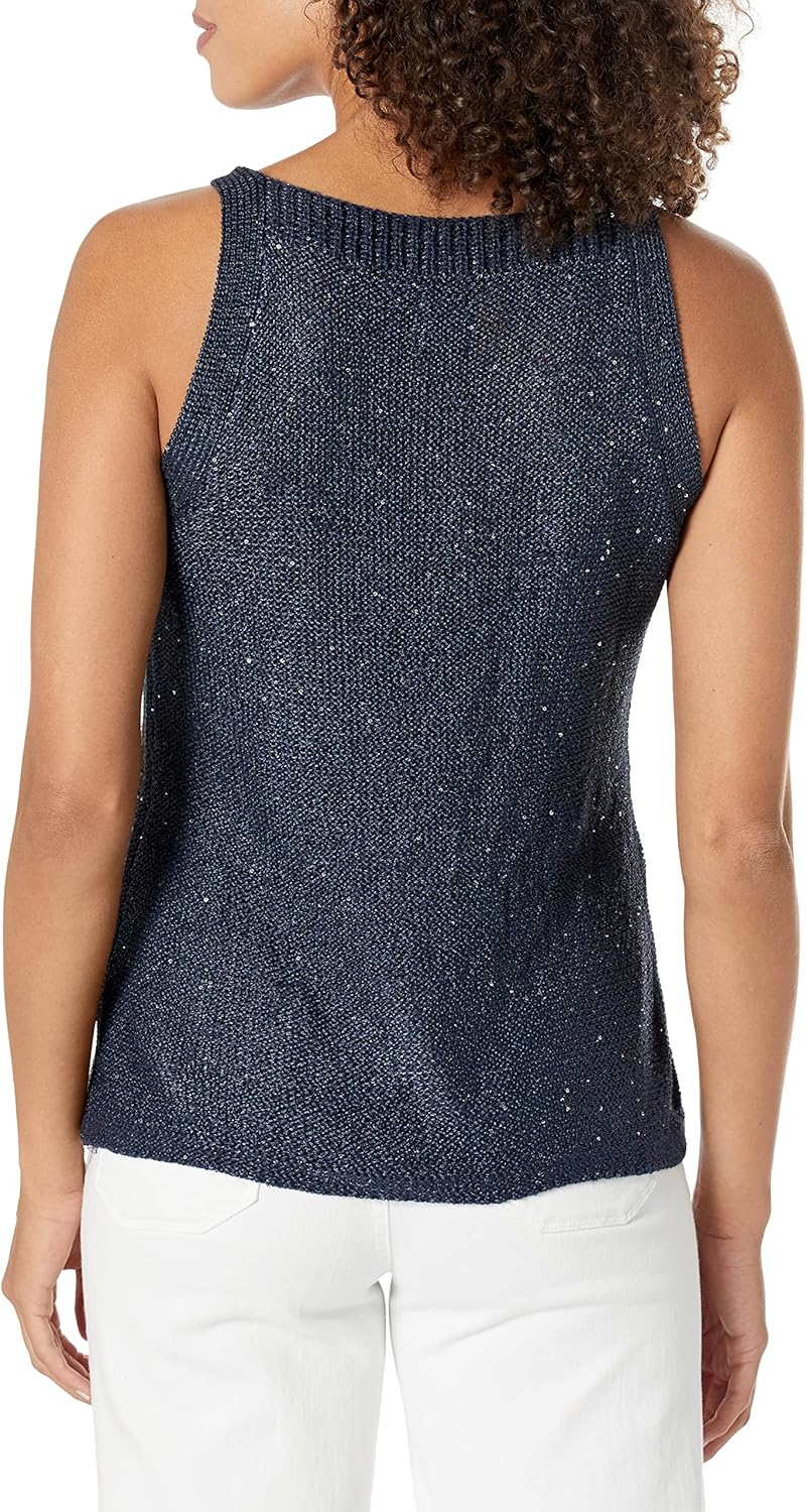 An easy anytime tank that gives your next look both texture and shine. Pair it with the matching cardigan or layer away and make it your own. Made with a more fitted silhouette, a round neck, and a hem that sits at the hip. Mindfully Made from fully fashioned knitwear that eliminates textile waste.