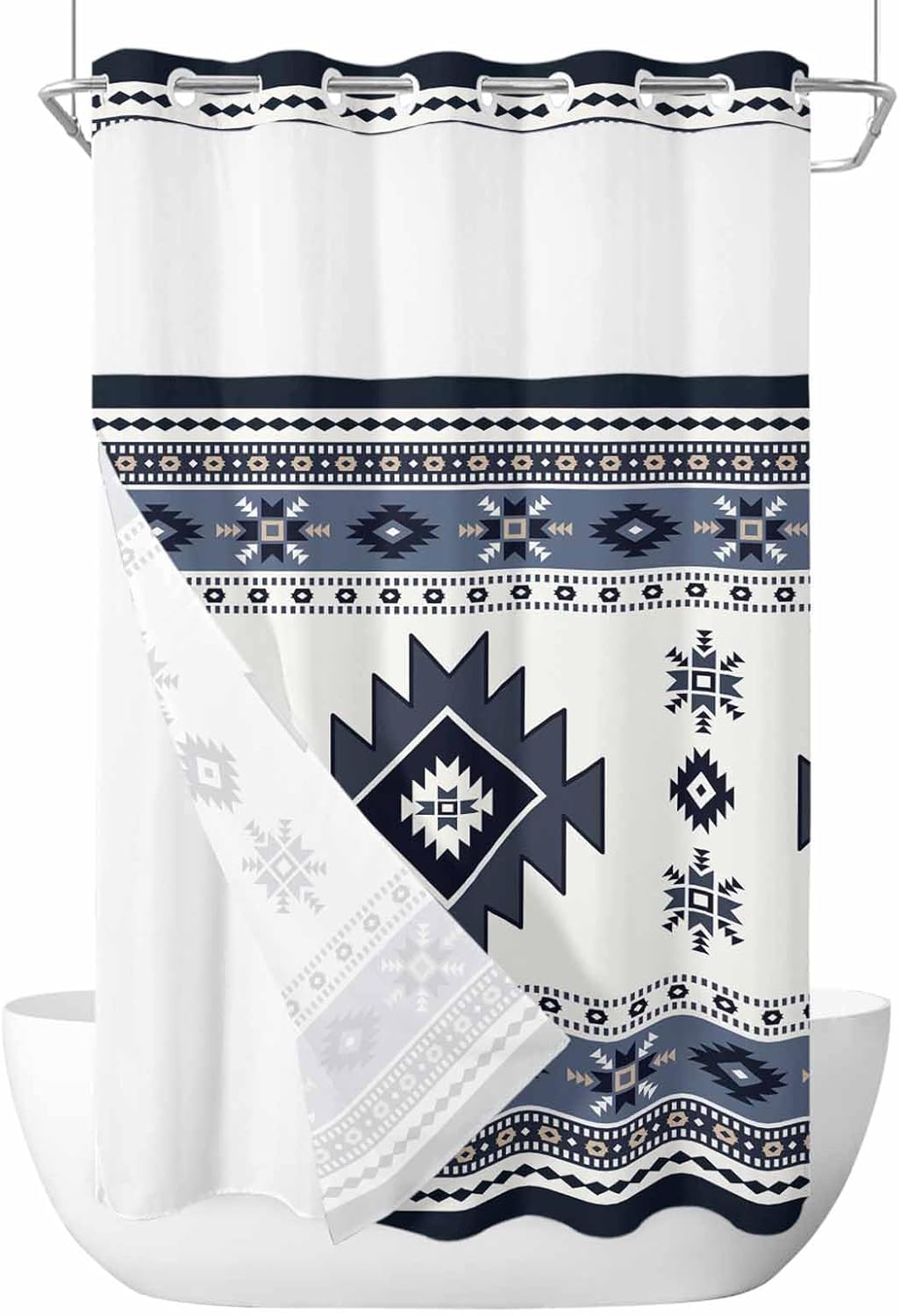 No Hook Shower Curtains with Snap in Liner Set---It's Waterproof Practical and Liven up Bathroom Decorations.Have you always looking for a shower curtain waterproof and sturdy, say goodbye to traditional a thin layer fabricHave you always looking for a shower curtain with snap in liner, heavy duty, easy to clean, no need to pay more for a linerHave you always looking for a shower curtain with split ring top hang design, say goodbye to hook shower curtain which is easy rustIf you're on the fence, take the plunge.No Hook Shower Curtains: Designed with split ring, no hooks required, easy to install and remove for clean. Hangs well and stay in place. No need to buy hooks and no need to remove the rod.Snap in Liner Set: Double layers waterproof fabric with snap on shower curtain liner, detachable liner curtain for cleaning, unsnap the inner liner, launder it and replace. The attached liner is light but lays flat and doesn’t come out at you while showering.To See Through Sheer Window: The mesh at the top of the shower curtain lets natural lights in and maintains privacy. The see-through window also helps water evaporation and lets the shower curtain dry quickly.Weighted Magnets: Sewn in 2 magnets at both corners to hold down inner liner, ensuring the shower curtain with liner set more heavy duty and waterproof.Material: Made of hotel fabric, polyester, sturdy for long time uses. No hook shower curtain has been a delightful addition to your bathroom, offering both aesthetics and practicality. Its hotel-style design and the vibrant colors add a touch of luxury and serenity to the bathtub/shower.