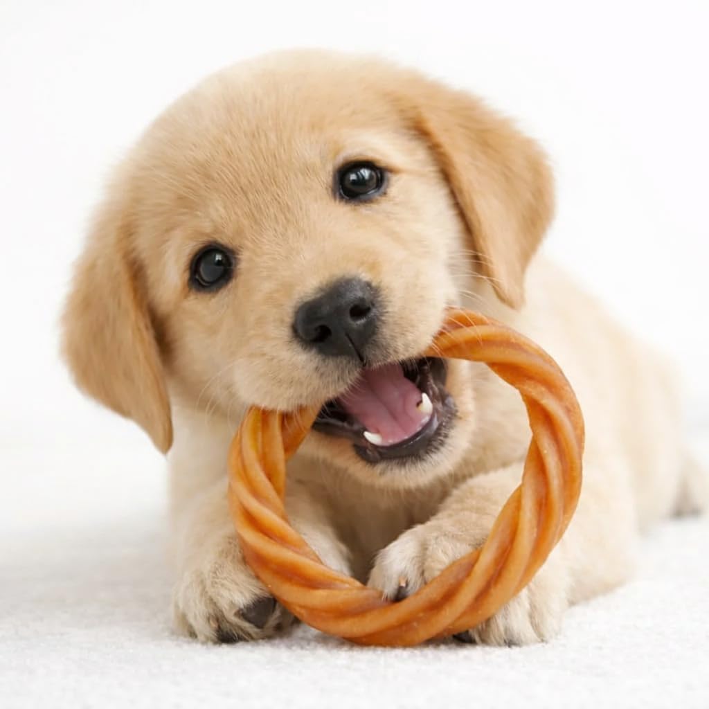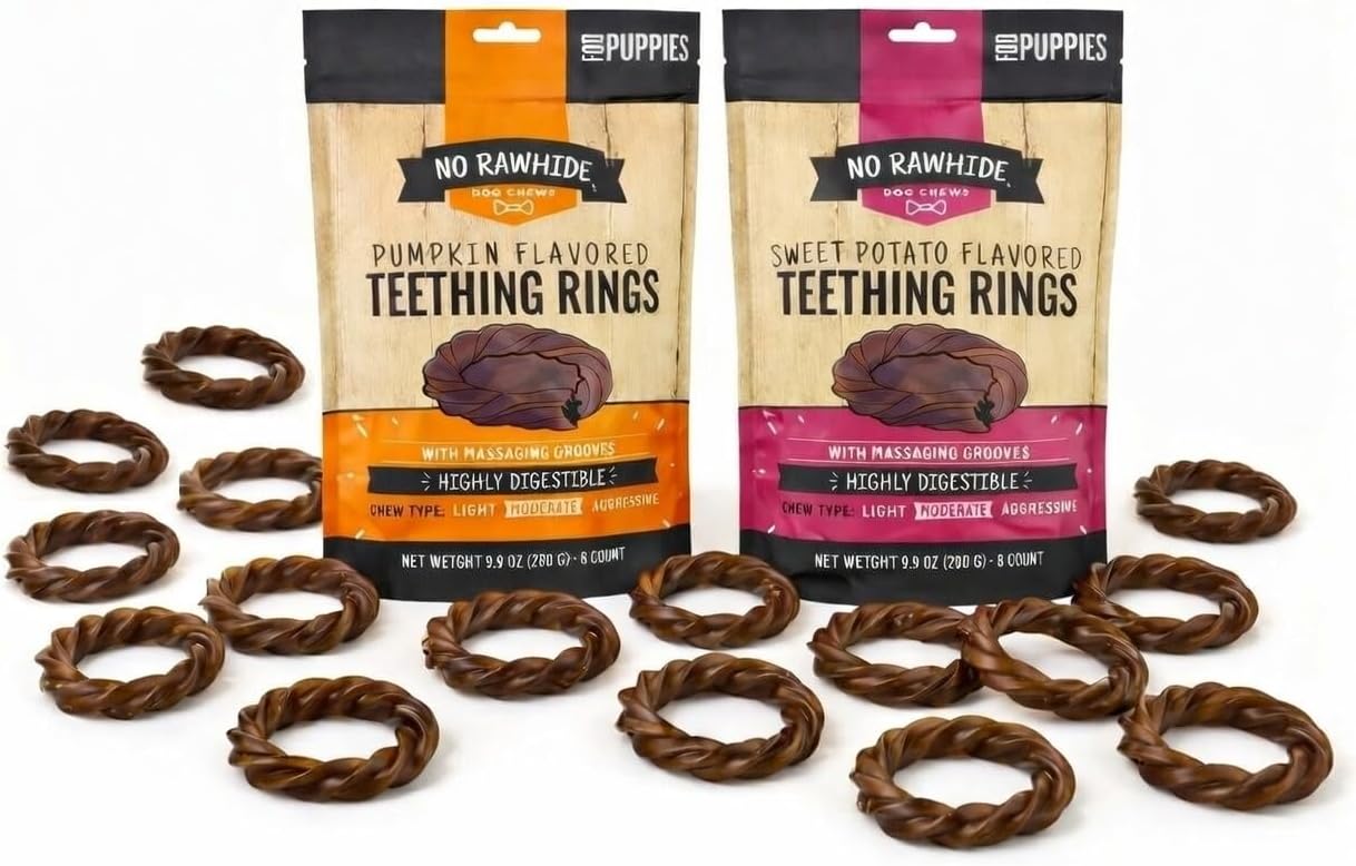 Treat your pup to No Rawhide Puppy Teething Rings! Crafted as a highly digestible alternative to rawhide, these chews are perfect for teething puppies with sensitive stomachs. Featuring a grooved texture, they satisfy your puppy’s natural chewing instincts while supporting dental health by cleaning teeth and strengthening jaw muscles. Made without artificial colors, flavors, or preservatives, these treats are ideal for moderate chewers seeking a safe, wholesome option. Give your furry friend a rewarding chew they’ll love—click "Add to Cart" now!