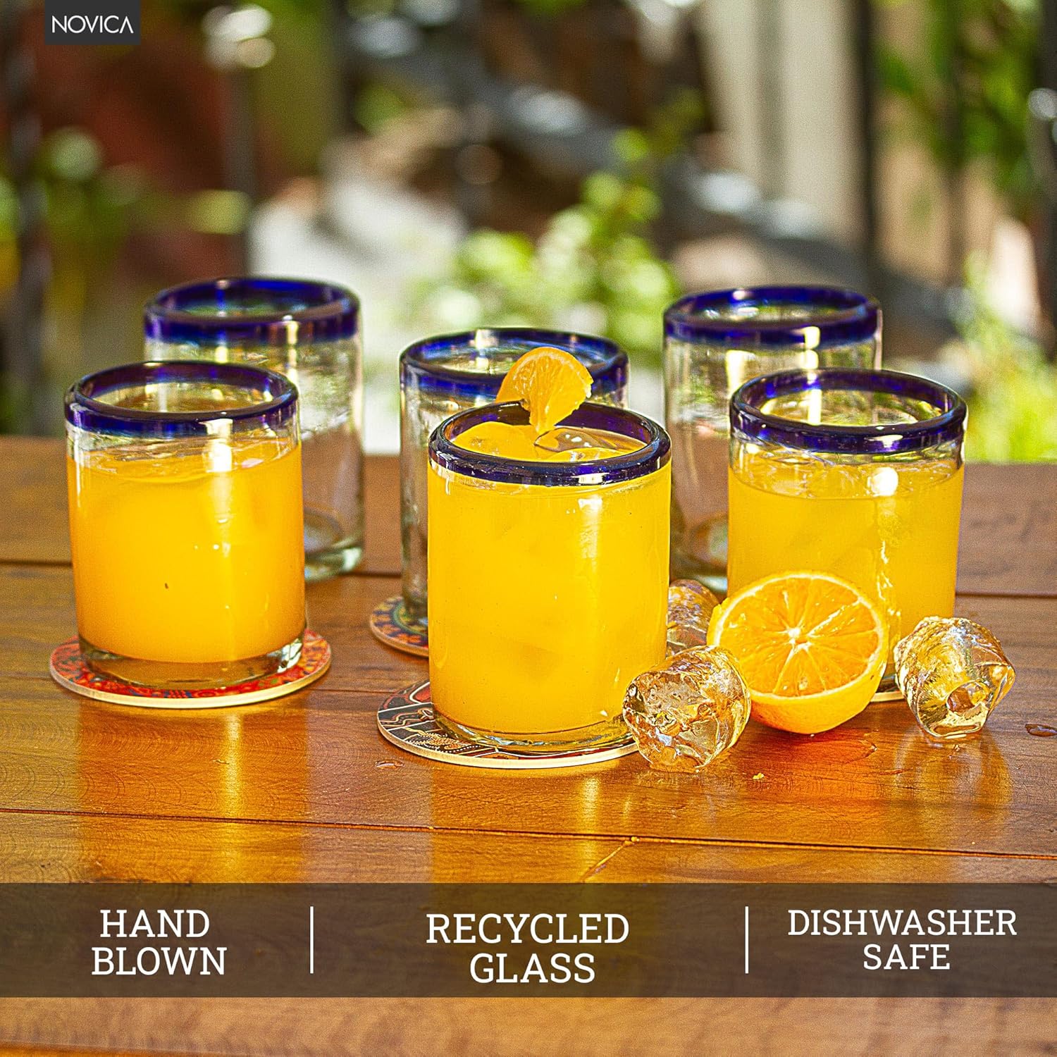 NOVICA Bordered in brilliant cobalt blue, these delightful tumblers bring a festive touch to any table setting. Classic and tasteful, the set of six comes from the NOVICA Handblown Collection. Because each piece is handmade, shape and size can vary slightly and tiny bubbles may appear within the glass. This exemplifies the hand-blown technique, making every piece a unique example of blown glass craftsmanship.