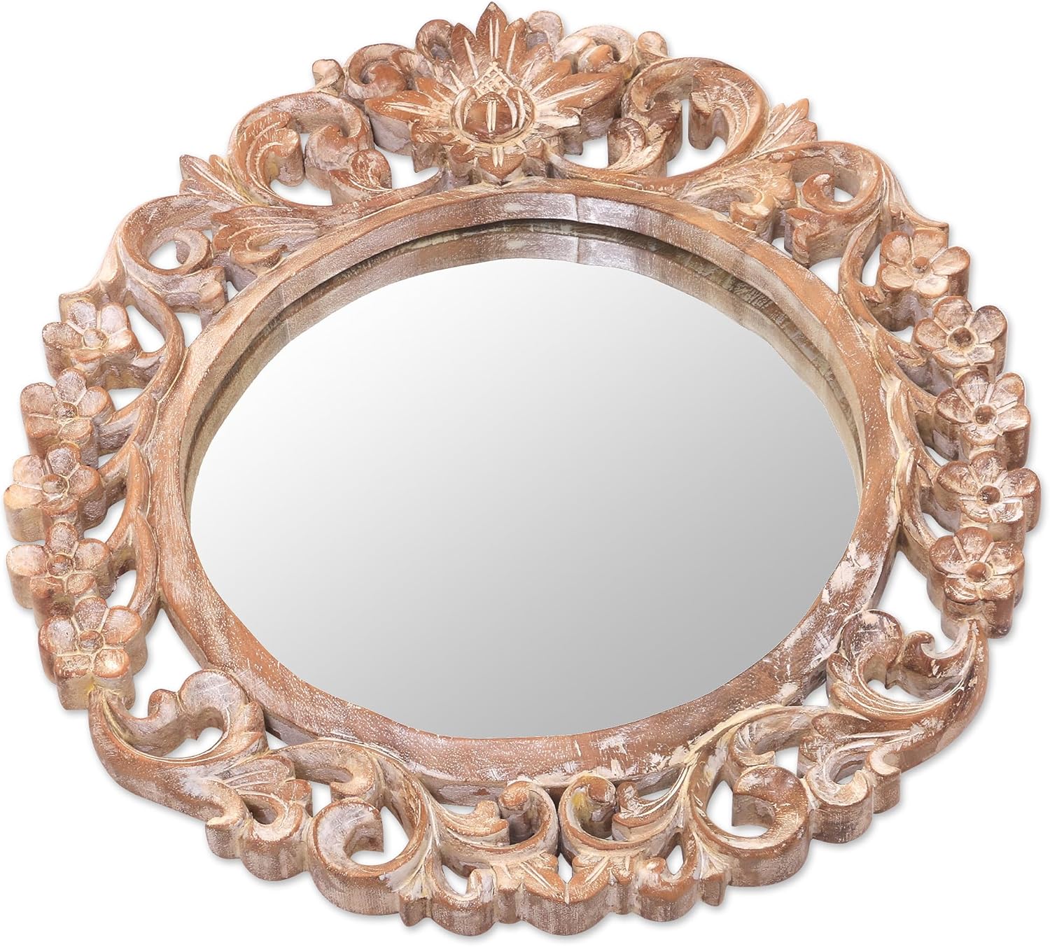 NOVICA, in association with National Geographic, works together with talented artisan designers around the world to produce stunning, keepsake treasures. Our mantra is to spread global happiness, so rest assured - we’ll do everything we possibly can to ensure you’re a happy customer. About this item: Carved by hand, flowers surround a beautiful wall mirror. Sarwaedi works in Balinese suar wood with an antiqued finish to surround the circular looking glass. Glass size: 9.75" diameter Frame: 15.5" H x 13.75" W x 1.0" D Mirror: 9.75" Diam. - Wood grain and color can vary slightly - Hand-crafted item -- color, size and/or motif may vary slightly - Features an aged antique finish About our Artist: 'I was born in Sukawati, Gianyar in Bali on April 21 1970. In the town where I grew up, most people are wood carvers, and so was my family. I learned wood sculpture by watching my parents. In those days, children began learning the art at a young age and I was not alone. Today, I continue working with wood, but I'm focusing on making vases and classic boxes. I give unique finishes to my designs to distinguish them from the others.'