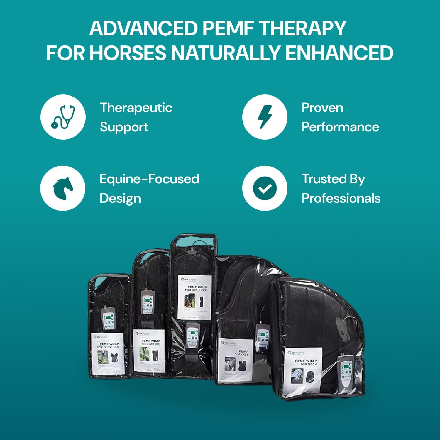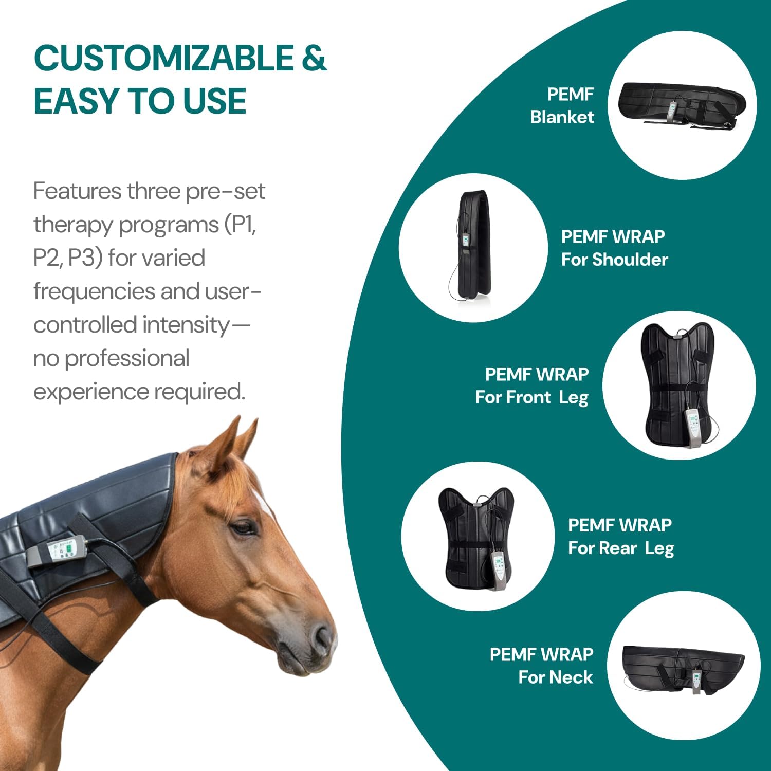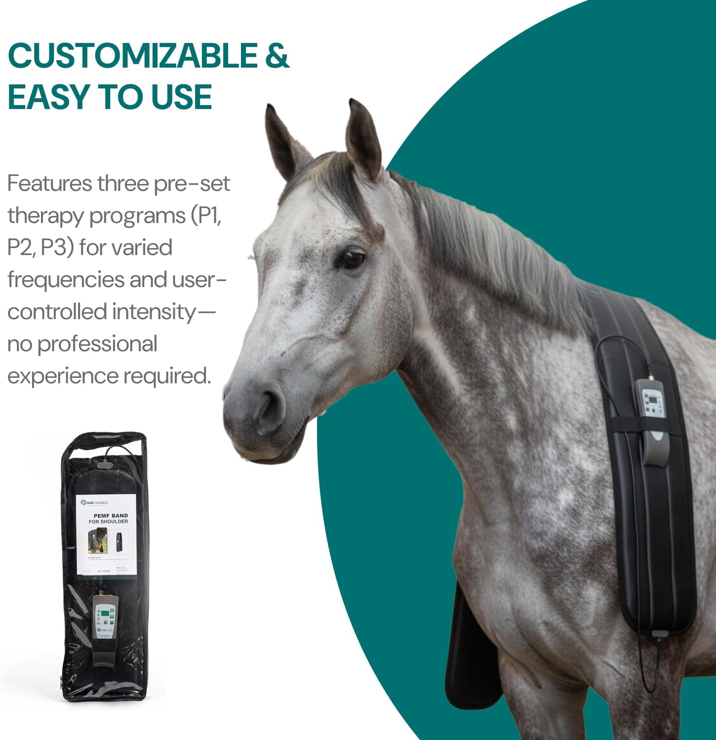 Please Note: This product is powered by a cord which is plugged into your AC power supply. It is not battery operated/wireless. (Not visible in photo). OMI’s new equine product line offers a full range of PEMF therapy products that are developed to combat the stresses inflicted on the horse during equestrian sports. PEMF therapy assists with equine pain relief, improving rest and recovery, stress relief, reducing inflammation and increasing blood circulation before and after exercise. It is suitable to treat all tissue types including muscles, ligaments and tendons to promote healthy joint function and optimize biomechanical efficiency in horses. How It Works:The gentle magnetic fields produced by the device induce electrical current inside the horse's body that helps to restore the blocked ion flow and stimulates regeneration processes. Features:- Easy to use, no training is required - Due to the low intensity of PEMF your horse will not experience any discomfort - Comes with adjustable straps to ensure a proper fit - Durable and easy to clean - Made in Europe and includes a 2-year warranty Three different programmes are available on each device: P1 (default programme, the frequency gradually increases from 3 Hz to 38 Hz and then drops back), P2 (default programme, the frequency continually and randomly changes between 1–99 Hz), P3 (the frequency is adjustable between 1 and 99 Hz). This Pulsed Electromagnetic Field Therapy Package for Horses Contains: 1 x PEMF BLANKET 1 x PEMF BAND FOR SHOULDER 1 x PEMF WRAP FOR NECK 1 x PEMF WRAP FOR REAR LEG 1 x PEMF WRAP FOR FRONT LEG
