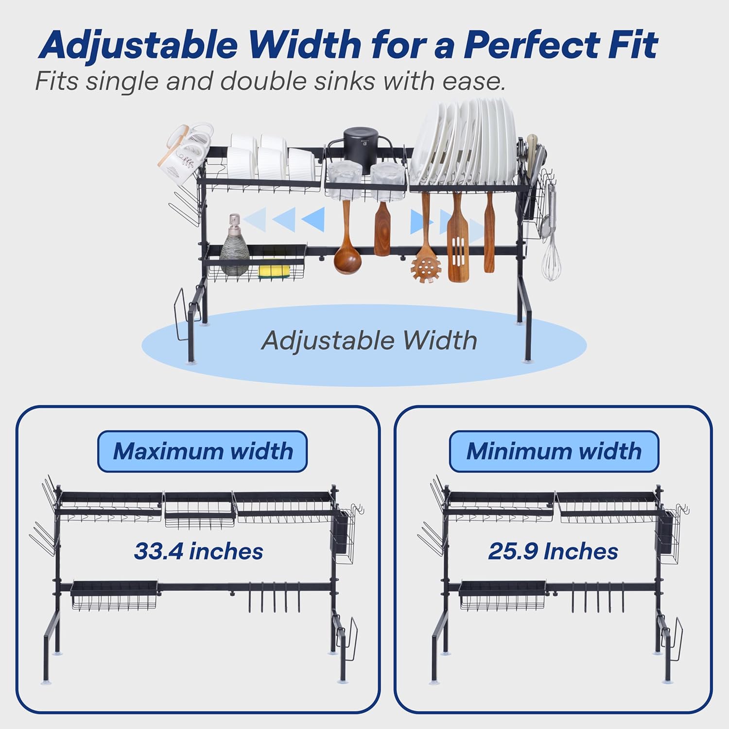 Upgrade your kitchen with this over-the-sink dish drying rack, designed to save space and enhance organization in small kitchens. Its adjustable length (26.8"–34.6") ensures a perfect fit for most sinks, while the over-the-sink design allows water to drain directly into the sink, preventing mess and water buildup. Crafted from sturdy stainless steel, this rack supports up to 80 lbs, offering a reliable and rust-resistant solution for drying dishes, utensils, and kitchen essentials. Its customizable baskets can be repositioned to fit your storage needs, and with four color options (Black, White, Brown, Silver), it seamlessly complements any kitchen aesthetic. Easy to assemble with clear instructions, this dish rack extends only 12.4 inches onto your counter, making it a compact yet spacious addition to your kitchen. Whether you need extra dish storage or a clutter-free counter, this over-the-sink dish drying rack is the perfect solution!