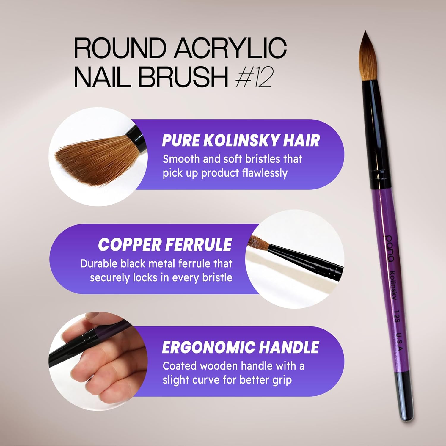 PANA ensures to provide the highest level of quality in materials in each product for durability and long-lasting use. Each brush handle is lightweight and easy to control to help nail techs apply the perfect acrylic bead effortlessly and smoothly. At the end of each PANA brush contains soft bristles that are made of finest and highest Grade-A quality Kolinsky hair unlike other brands on the market that tend to use lower Grade-B or Grade-C quality Kolinsky hair. The fine and soft bristles are firmly held by a sturdy alloy ferrule to prevent from splitting, fraying, and deformation of the hairs to avoid acrylic clumping. Providing quality consistency and comfortability, PANA acrylic nail brushes are also made in various designs to give a pop of personality and color to nail techs of all expertise.