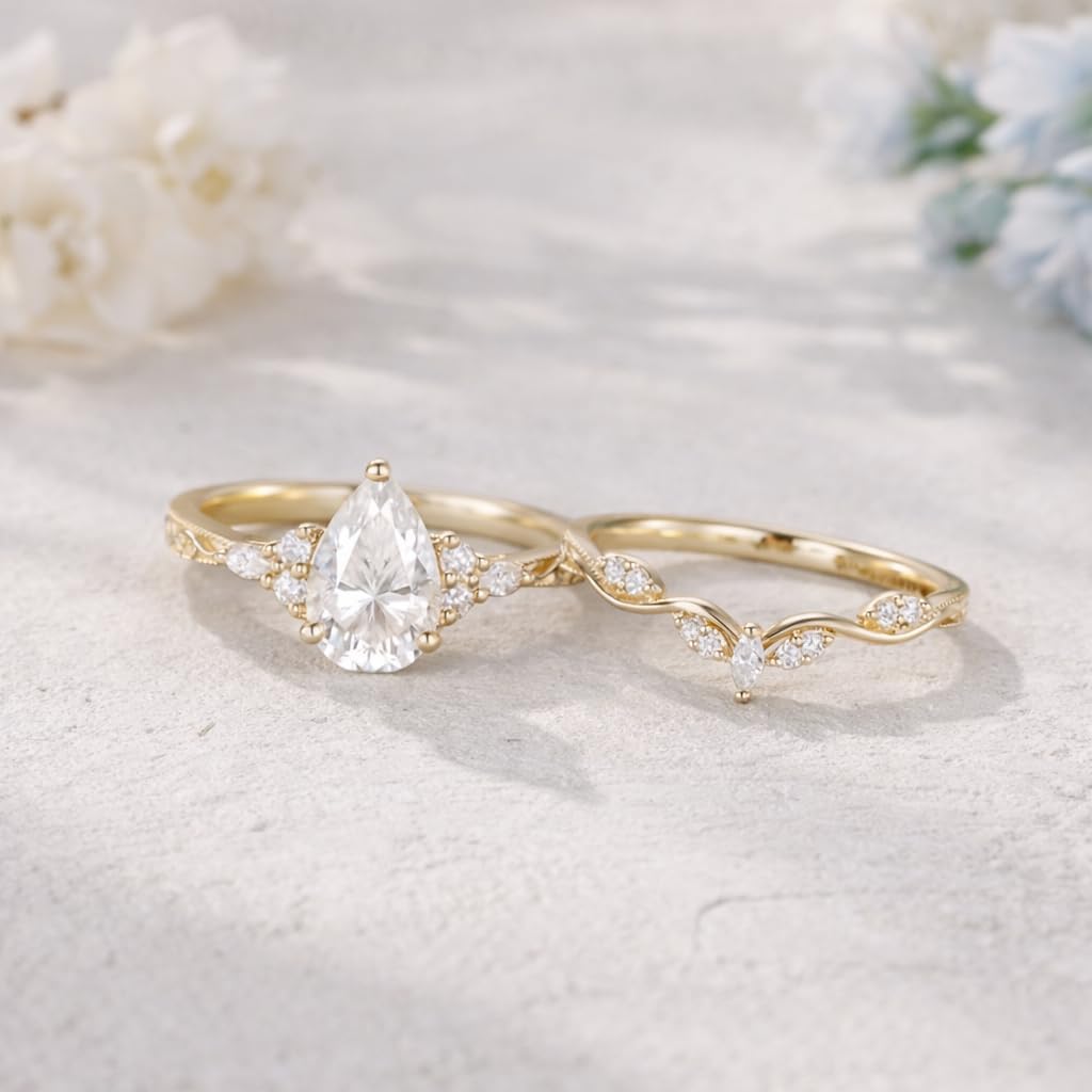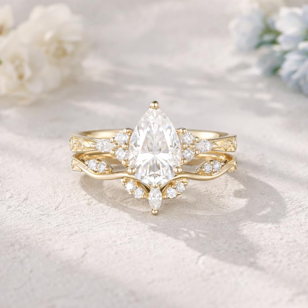 Celebrate everlasting love with this exquisite Pear Cluster Moissanite Bridal Wedding Ring Set crafted in radiant yellow gold. The breathtaking pear-cut moissanite center stone captures light beautifully, offering remarkable brilliance and fire that rivals traditional diamonds. Designed with intricate Art Deco-inspired engraving and a graceful twisted band, this ring set reflects vintage elegance with a modern touch. The matching contoured wedding band enhances the engagement ring’s sparkle, creating a perfectly balanced and luxurious bridal look. Whether chosen for a proposal, wedding ceremony, anniversary celebration, or meaningful birthday gift, this moissanite bridal set symbolizes commitment, beauty, and timeless romance. Wear the rings together for a complete statement or separately for versatile elegance. A stunning expression of love designed to shine for a lifetime.
