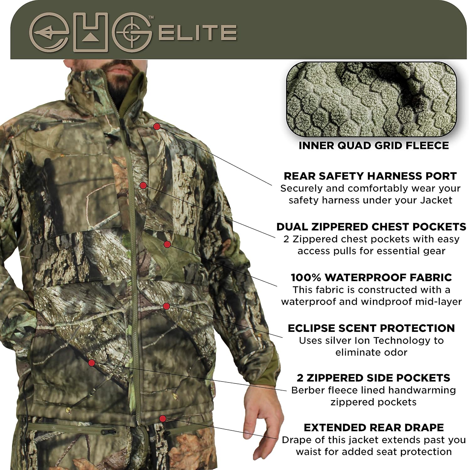 The EHG Elite Pineland Series Camo Hunting Jacket has been Engineered by Hunters for Hunters. Functionally designed with 310 gsm Brushed, silent polyester. This mid-weight shell with ultra warm grid fleece insulated technology. The Pineland Hunting Jacket is constructed with 100% waterproof and breathable fabric, with a built in waterproof mid-layer laminate. Equipped with Eclipse Scent Free Technology utilizing silver ion technology to eliminate odors, and a "shake it off" DWR water resistant treatment. The Pineland Series is available in Mossy Oak Contour and Break Up Country and is ideal for early and mid-season.