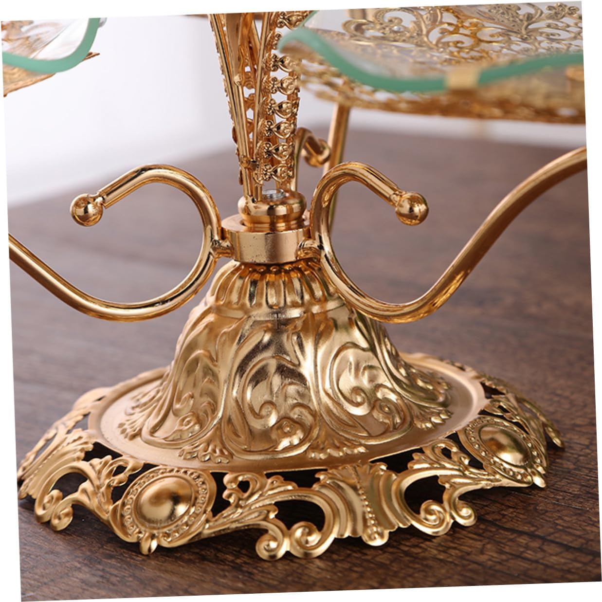 Package List 1 x Fruit Plate Features -Size: Approx. 47.00X41.00X28.00cm / 18.47X16.11X11.00in -Color: Golden -Material: Iron & Glass -Product Info:Multi-layer fruit tray - Elegant appearance and workmanship, and decorative snack serving tray. - Wide range of uses, suitable for displaying cupcakes, desserts, biscuits, fruits, candies, chocolates, pastries and snacks cupcake fruits holder. - Can be used as a cupcake stand, wedding cake stand, dessert stand or plates for providing fruit, bread and other sweets stands for dessert table. - Widely applied in living room, dining room, kitchen, hotel, restaurant, etc layered serving tray. - A thoughtful and unique housewarming gift for your co-workers and friends desserts holder.Goods Informationsnack fruit plate You can store your all kinds of food, such as cake, candy, snacks, chocolate, dessert, etc.Food Serving Tray This product is a dessert stand, made of iron and glass material, and .Dinning Table Dessert Holder A perfect housewarming gift for friends and co-workers, and they will like it