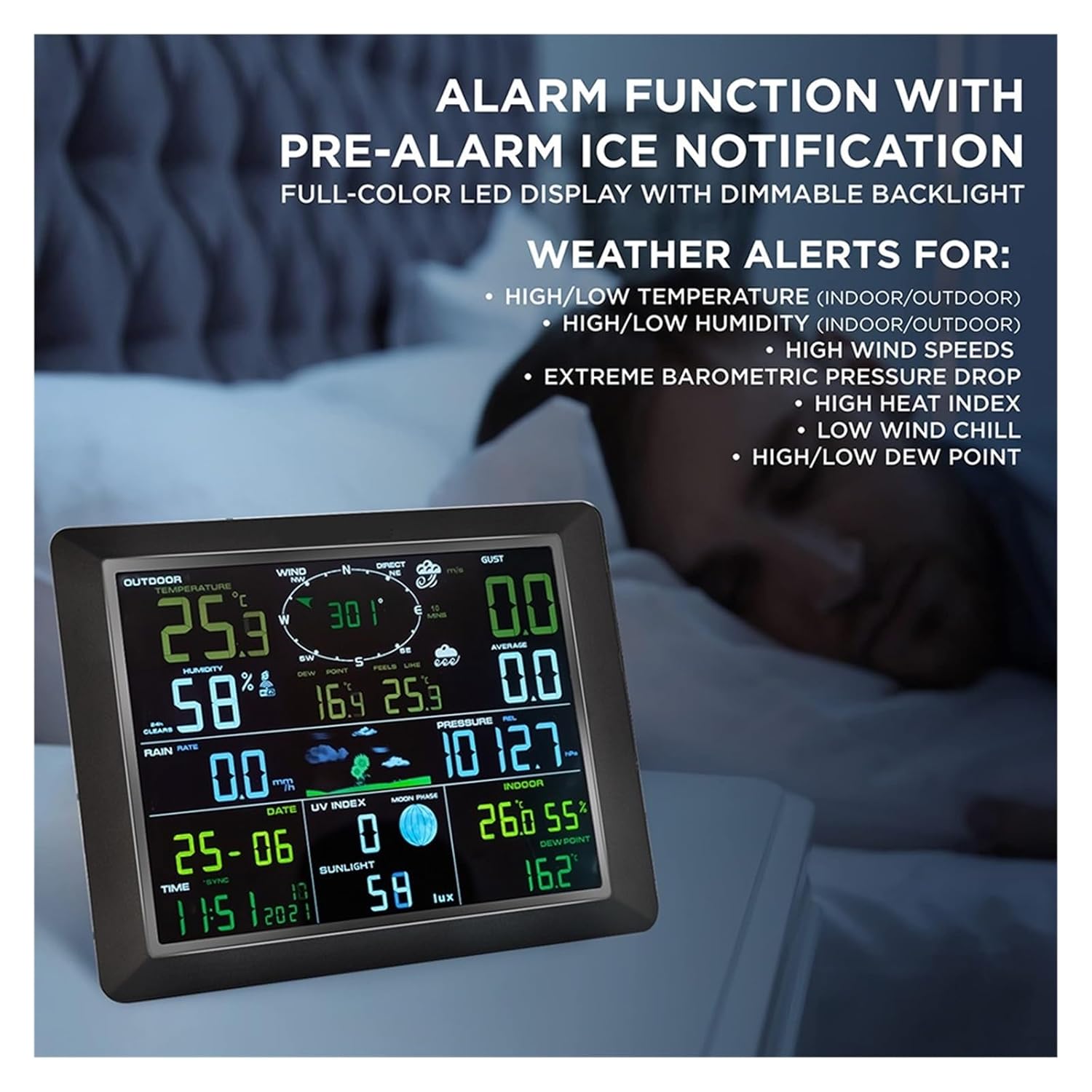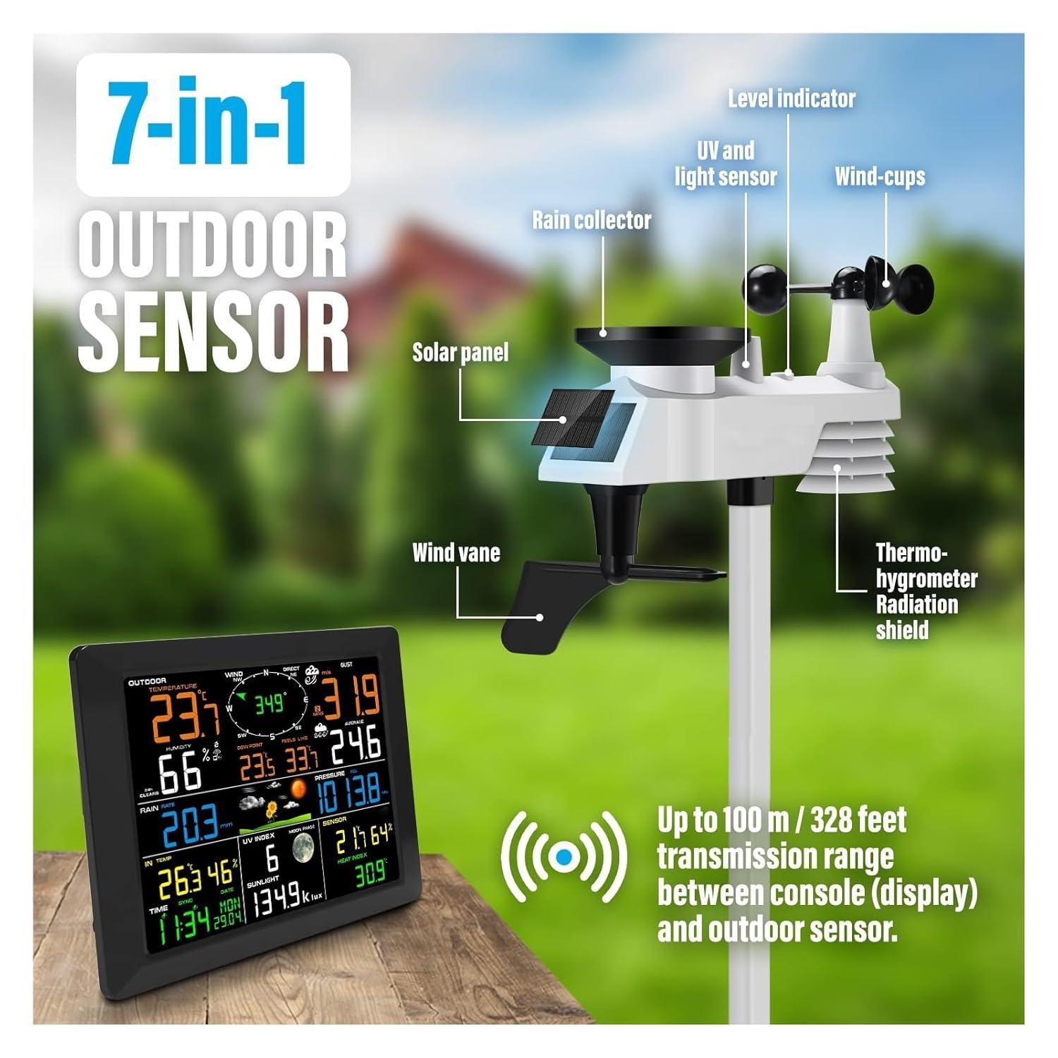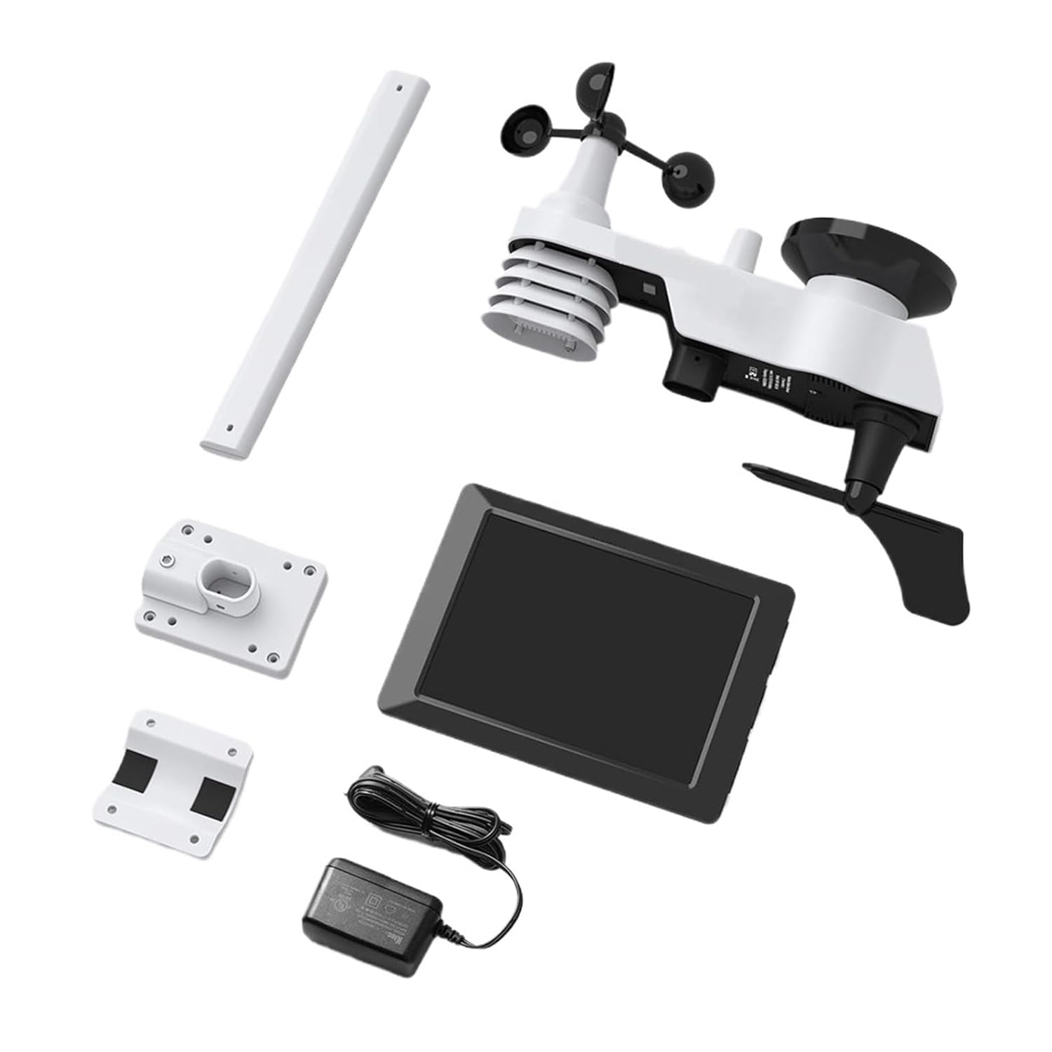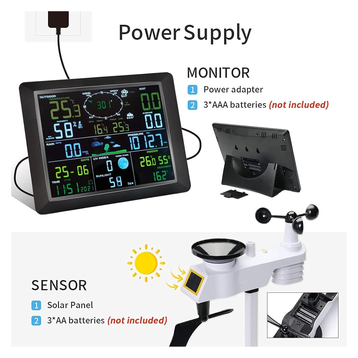 Indoor temperature: 37 °F to 140 °F Outside temperature: -40 °F to 140 °F Rain: 0-396 inches Wind direction: 0-360 degrees Wind speed: 0-112 mph (m/s; km/h; knots; bft) Pressure: 8.85-32.5 inHg Transmission frequency: 433.92 MHz Transmission: Up to 328 feet outdoors Base station (display) with stand Weather Station Setting Procedure Power Up Whole Set Firstly: Insert 3 AA batteries into the integrated outdoor sensors, LED flash 3 seconds and updates weather data every 16 seconds (Press the white LED button to reset wireless sensor array). Secondly: Power on the wireless thermo-hygrometer sensor with 2 AAA batteries, LED flash 3 seconds and updates temp and humidity data every 60 seconds. Last: Connect the indoor console with 5.9V DC Adapter, wait a few minutes and all data will update in the display (Don't Touch Any Button). 3 AAA batteries installing can save the console button setting when powered off. Warm Tips (Outdoor Integrated Sensors) 1. Tip the Integrated outdoor sensor back and forth several times to verify the rain gauge is not reading 0.00. 2. Rotate the wind cups manually or with a constant speed fan to verify the wind speed is not reading 0.0. 3. Verify the indoor and outdoor temperature or humidity match closely with the console and sensor array in the same location. Allow about 30 minutes for both readings to stabilize. Weather Station Package: 1 x Indoor Display Console 1 x Solar Integrated Sensor Array 1 x Mounting Bracket Back Plate 1 x Mounting Pole + 1 x Foot Mounting 1 x English Manual + 1 x WiFi Setup Manual 1 x Power Adapter