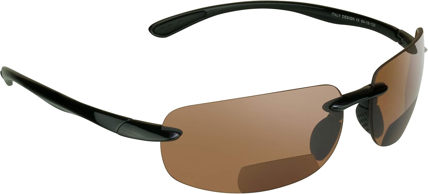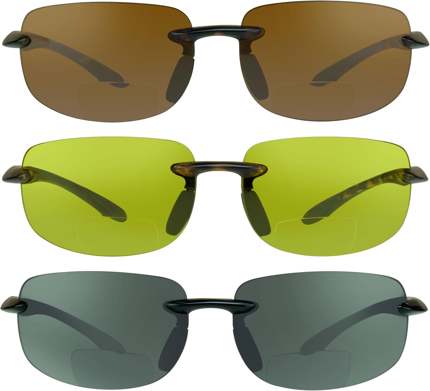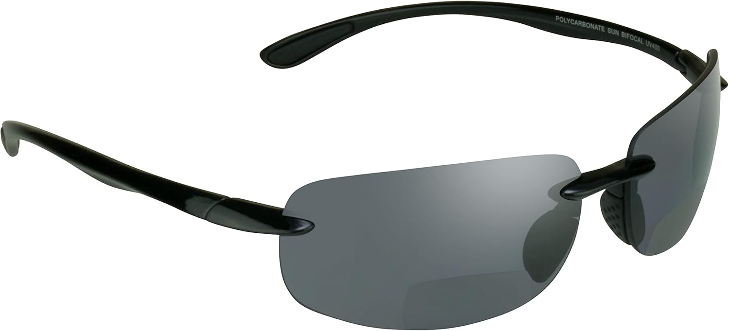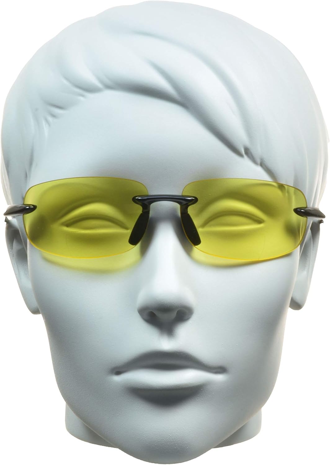 Kumatage rimless BIFOCAL glasses are made for the avid outdoorsman and outdoorswoman! Sporty, sleek rimless style is lightweight and comfortable. Now you can play golf, tennis, baseball, run, cycle, hike, drive or ride motorcycle and be able to read maps, scorecards, menus, GPS or smart phone without switching glasses!Choose from three lens colors: DARK SMOKE, YELLOW or HD BLUE BLOCKING lenses: YELLOW LENS: Also known as night vision lenses, yellow sunglasses eliminate the "halo effect" around lights and brightens vision at night. For cloudy days & rainy days, yellow lens also eliminate haziness and increases clarity. HD BLUE BLOCKING LENS: Reduces blue light in the UV spectrum, which causes haziness; leaving a clearer and crisper view. Very comfortable lens perfect for golf, driving and tennis. DARK GRAY LENS: Filters out the most light in sunny conditions compared to any lens color. Provides a natural view without distorting colors.Available in the following reader powers: +1.50, +2.00, +2.50 or higher. Fits Medium to most Large heads - very versatile frame.Each pair includes a FREE microfiber cleaning case.