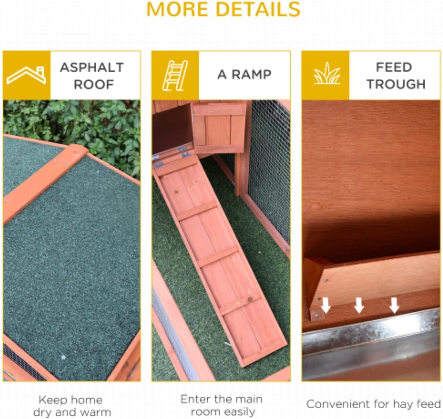 Spacious and comfortable, this rabbit cage measures 5.1 feet long from end to end, providing a long leaping distance and plenty of room for two rabbits. The extra few inches of space will keep your pet happy. The asphalt roof and painted fir walls are rainproof and durable. Designed for the outdoors, this large outdoor rabbit cage can withstand rain showers. The mesh wire keeps your rabbit inside the cage and prevents predators from entering, while the roof provides shade in warm weather. Product Information Product Type:General Item Product Name: Rabbit Hutch Place of Origin:China Main Color:Natural Wood Main Material:Wood Product Dimensions Assembled Length (in.):61.40 Assembled Width (in.):22.80 Assembled Height (in.):26.80 Weight (lbs.):13.00