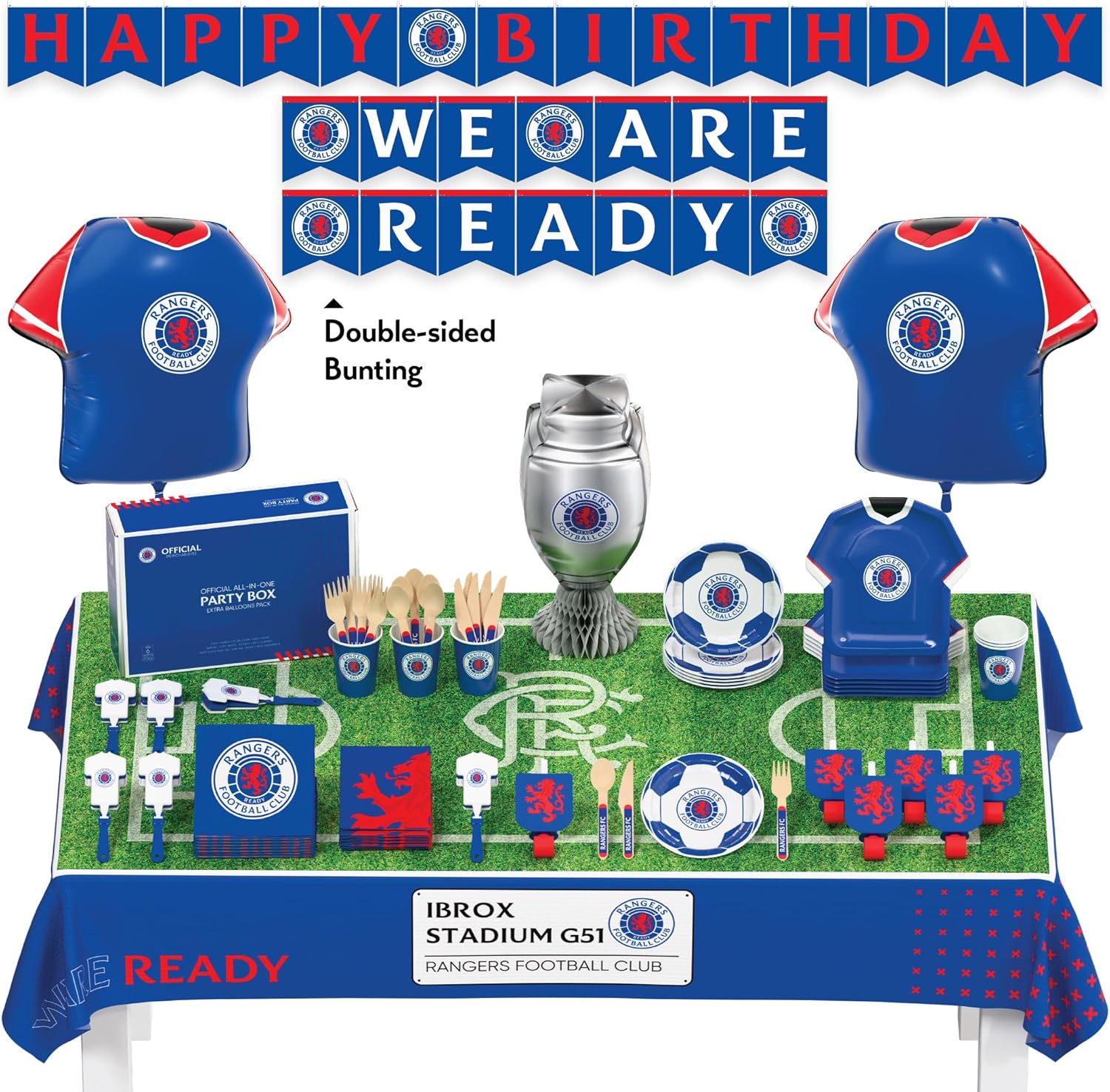 Transform your celebration into a true Rangers FC extravaganza with this comprehensive 77-piece party supplies set. Perfect for birthdays or match day festivities, this official Rangers FC collection has everything you need to host a memorable gathering for six guests. The set features an array of team-themed decorations, including eye-catching balloons that create an authentic stadium atmosphere, and coordinated tableware to complete your football-themed setup. From the iconic blue and white colour scheme to the official Rangers FC branding, every element has been designed to showcase your support for the legendary Scottish club. Whether you're planning a young supporter's birthday party or gathering friends for a crucial match, this party pack provides all the essential decorative elements to create the perfect Rangers FC celebration atmosphere. Rangers FC Officially ALL-IN-ONE Party Box Contains: [ (Quantity) Item name —— (Dimensions) ] (1pc) Paper Tablecover —— (1.2m x 1.8m) (12pcs) Luncheon Napkins —— (33cm x 33cm) (12pcs) Beverage Napkins —— (25cm x 25cm) (6pcs) Hot/Cold Paper Cups —— (266ml) (6pcs) Jersey Shaped Dinner Paper Plates —— (23cm height) (6pcs) Appetiser Paper Plates —— (17cm diameter) (1set) Double printed decorative Bunting —— (4m) (1pc) Football Club Trophy Balloon Table Centerpiece —— (45cm) (6pcs) Jersey Shaped Clappers (6pcs) Party Kazoo Whistles (6pcs) Wooden Spoons (6pcs) Wooden Forks (6pcs) Wooden Knives (2pcs) Jersey Shaped Foil Balloon