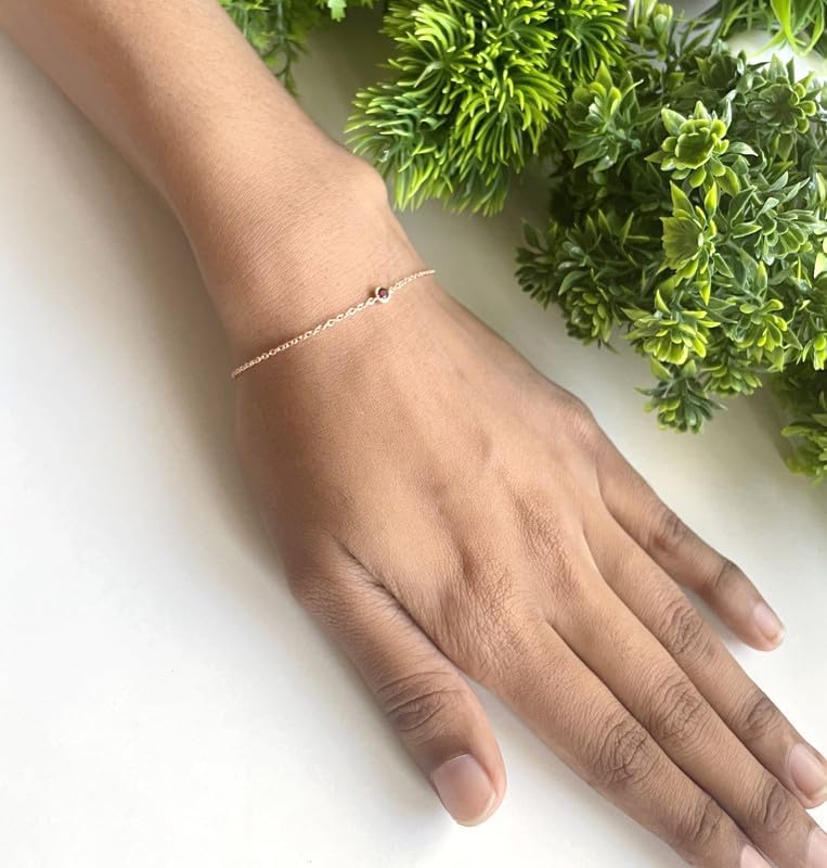 This Bracelet Crafted in 925 Sterling Silver, available in 14K White, Yellow and Rose Gold Plating. Round Cut simulated Red Ruby Stones set in Bezel setting.