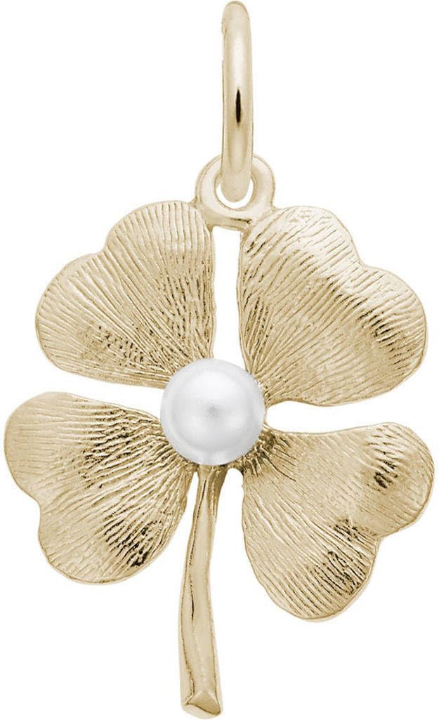 Four leaf clover w/ simulated pearl charm by Rembrandt. Measures approximately 0.79 inches x 0.67 inches (20.11mm x 17.09mm). Available in several metals.